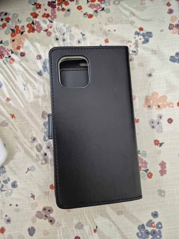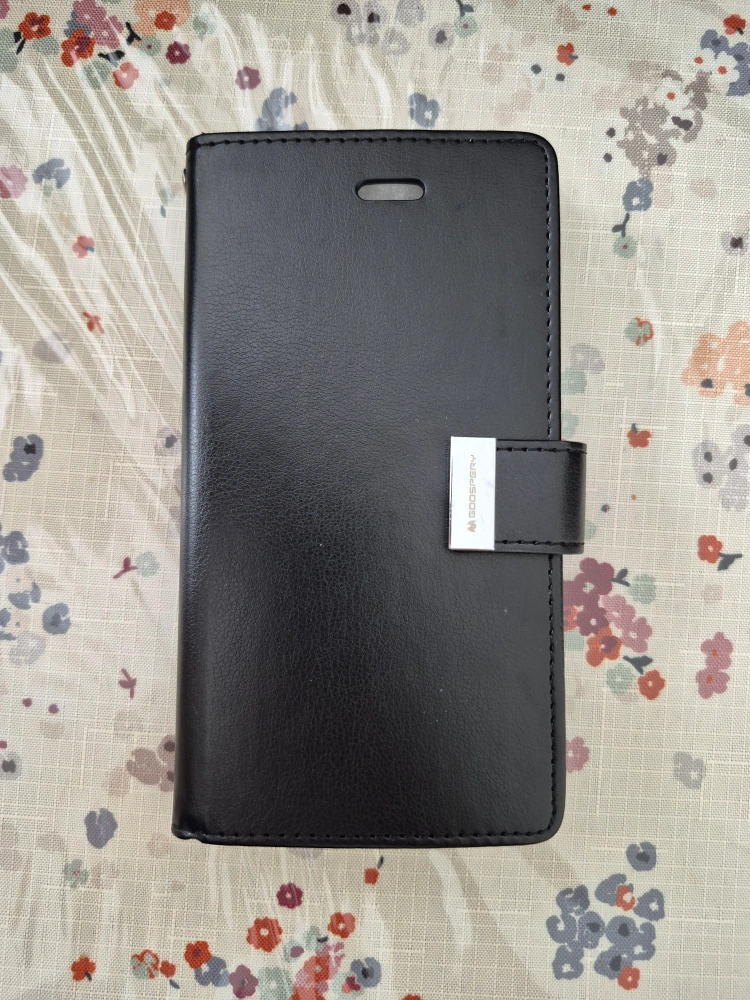 A black leather phone case. Features a magnetic closure. It has slots for cards or cash, perfect for keeping everything organized.