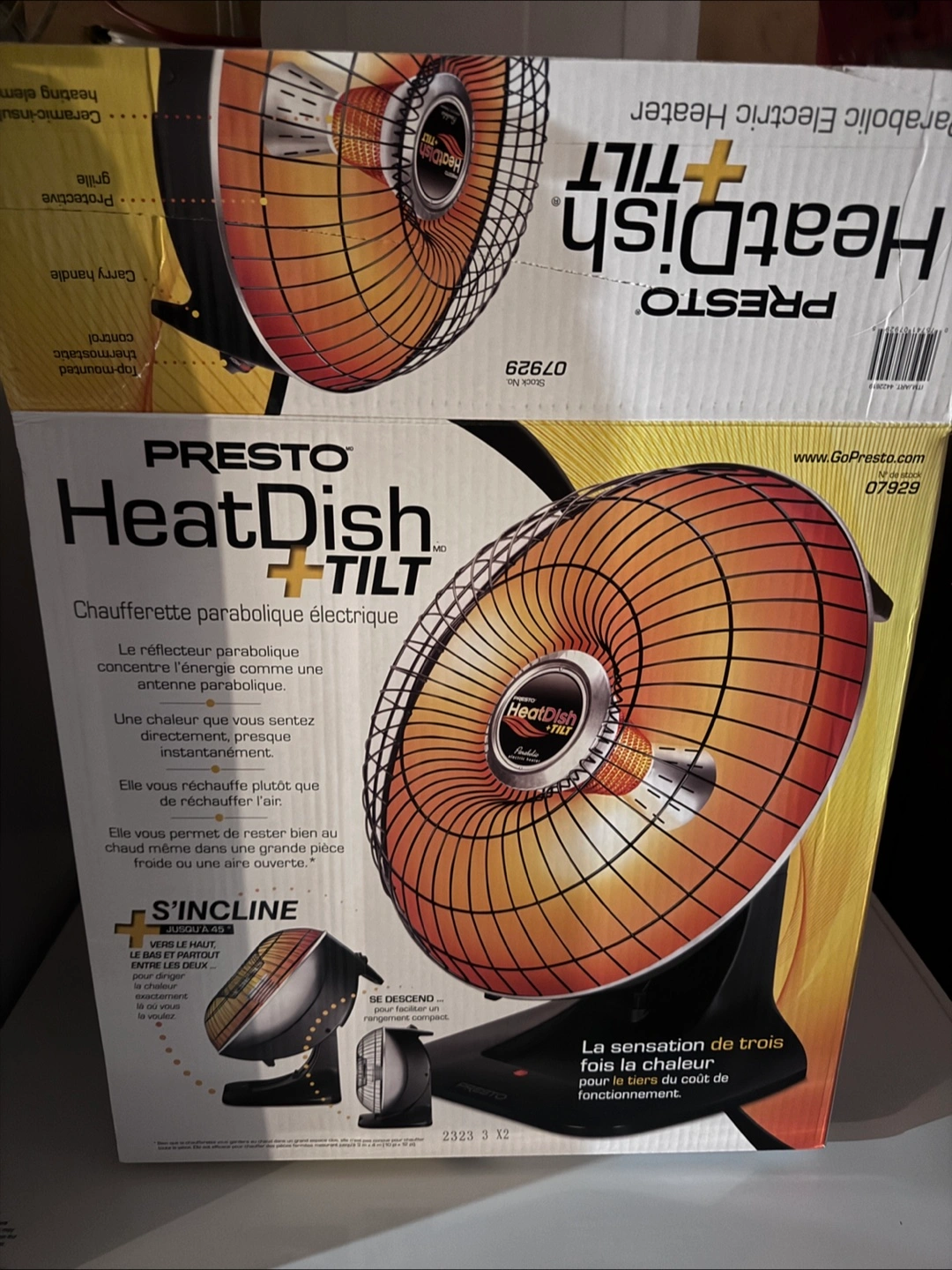 A cozy space heater, perfect for chilly days and nights. The heater appears new, still in its original packaging. It can be tilted to direct heat where you want it.