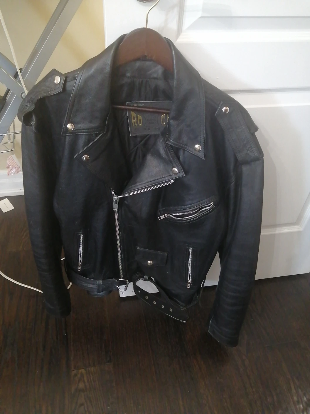 A classic black leather motorcycle jacket. Features multiple pockets, zippered closure, and silver accents. Buckle detailing and padded shoulders. Perfect for those crisp autumn rides, it will certainly keep you feeling cozy.