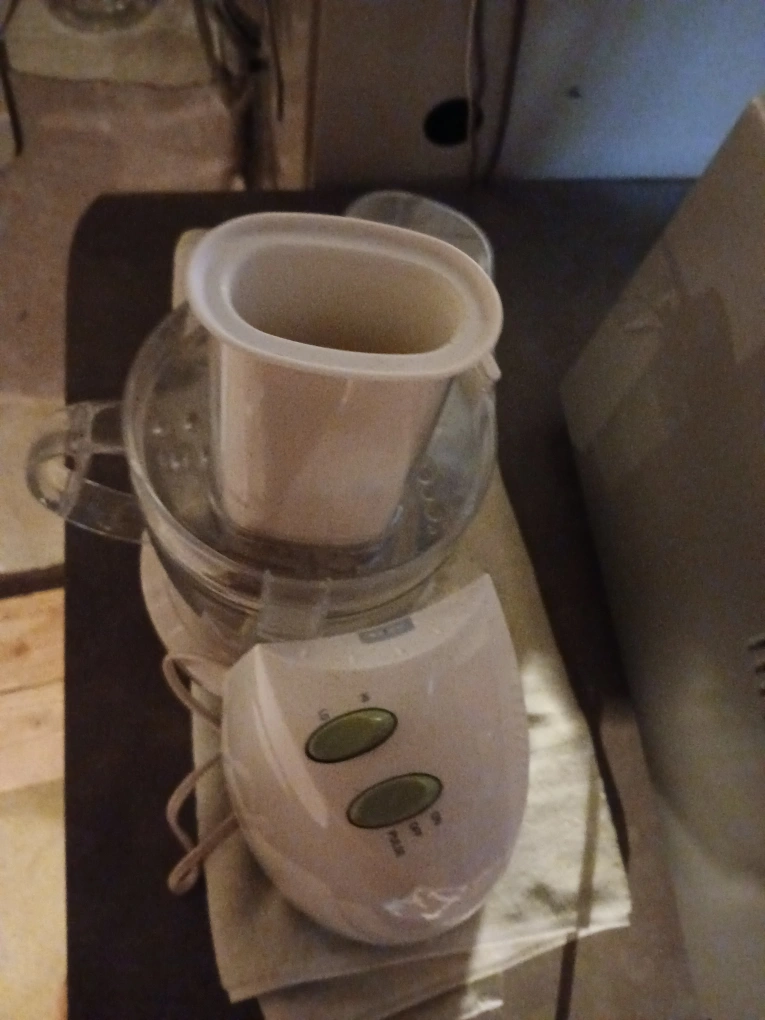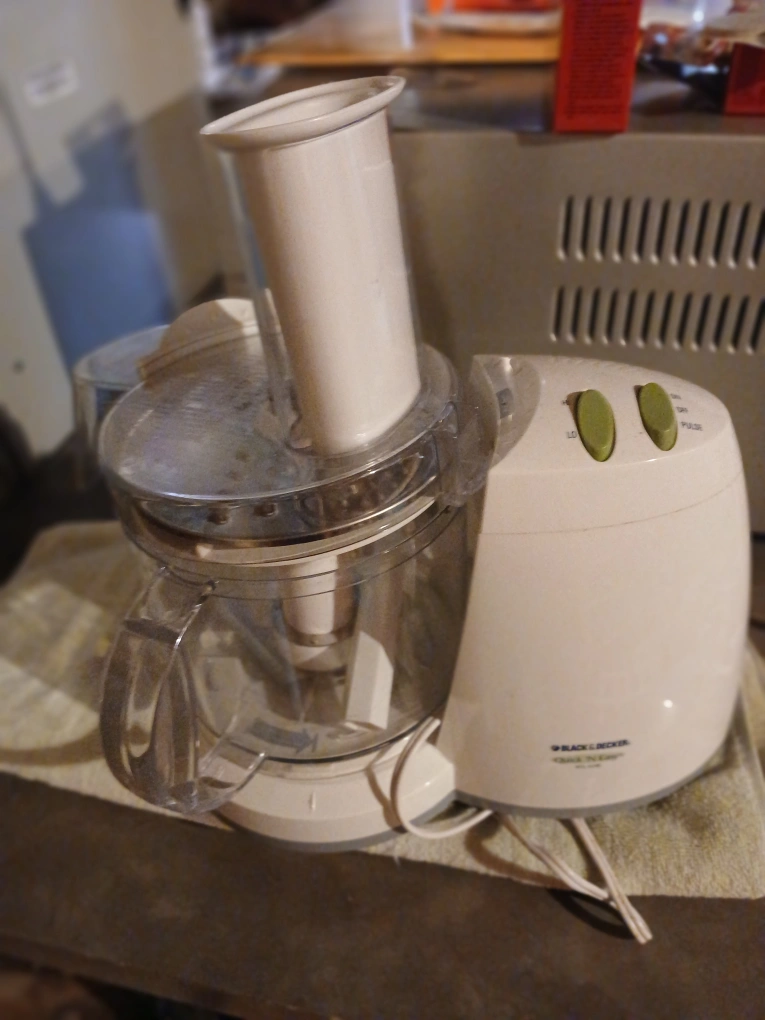 The food processor appears to have a white base. It contains a clear bowl with a handle, and a lid. There are two green buttons and a dial on the base. This is a great item to have on hand when preparing a healthy meal for yourself or the family.