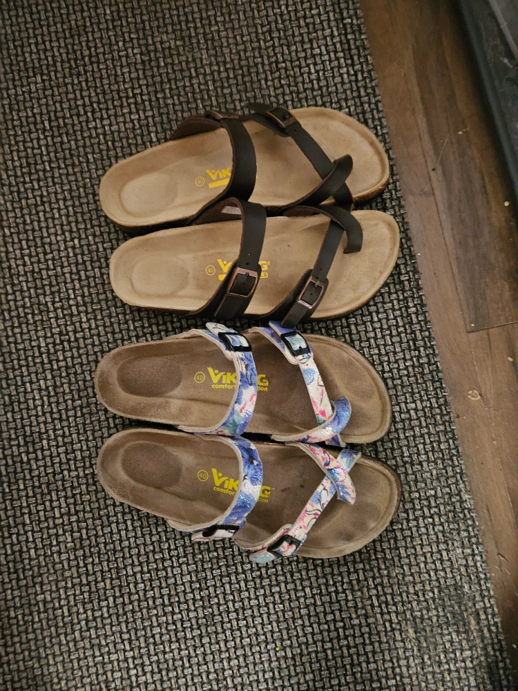 Two pairs of sandals, one used only indoors the other outdoors. asking $25 each. ideal for a casual day out. Both pairs feature adjustable straps, sturdy soles, and comfortable footbeds.