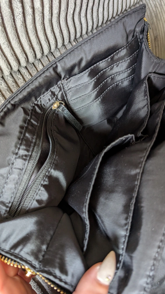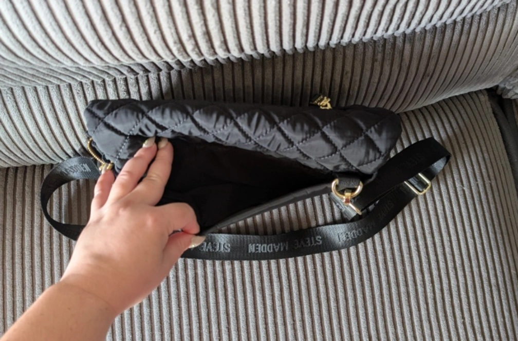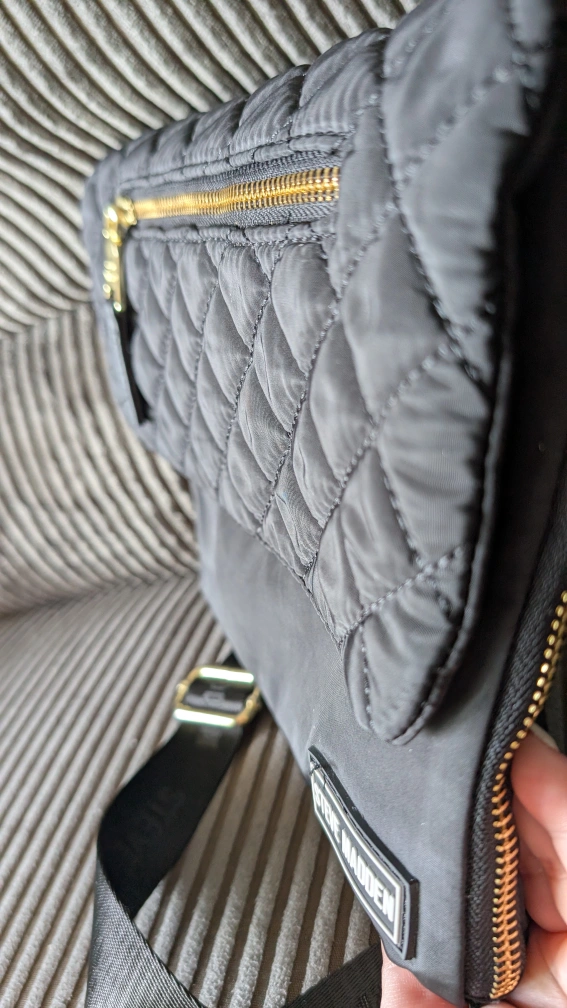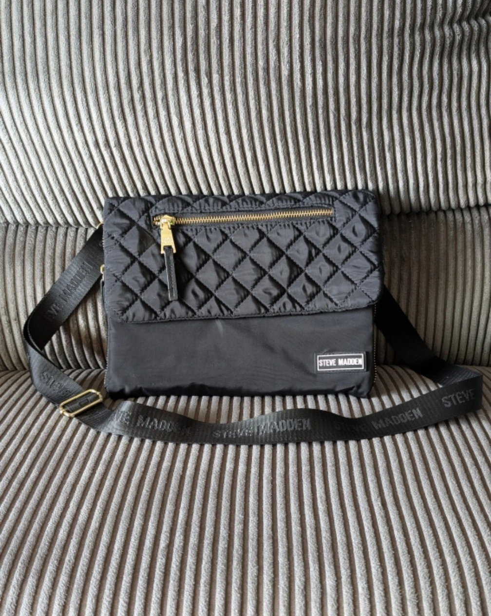 If you favor bags that are not only cute but Practical then you'll LOVE this Black Steve Madden Crossbody Bag! This bag has 2 outter pockets and multiple inner pockets! Many inner pockets resemble a wallet and if that wasn't useful enough this bag can widen its capacity by pulling down the side zippers! Incredibly functional without sacrificing Asthetix!