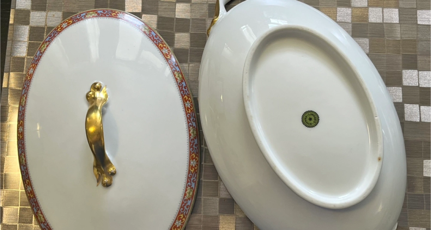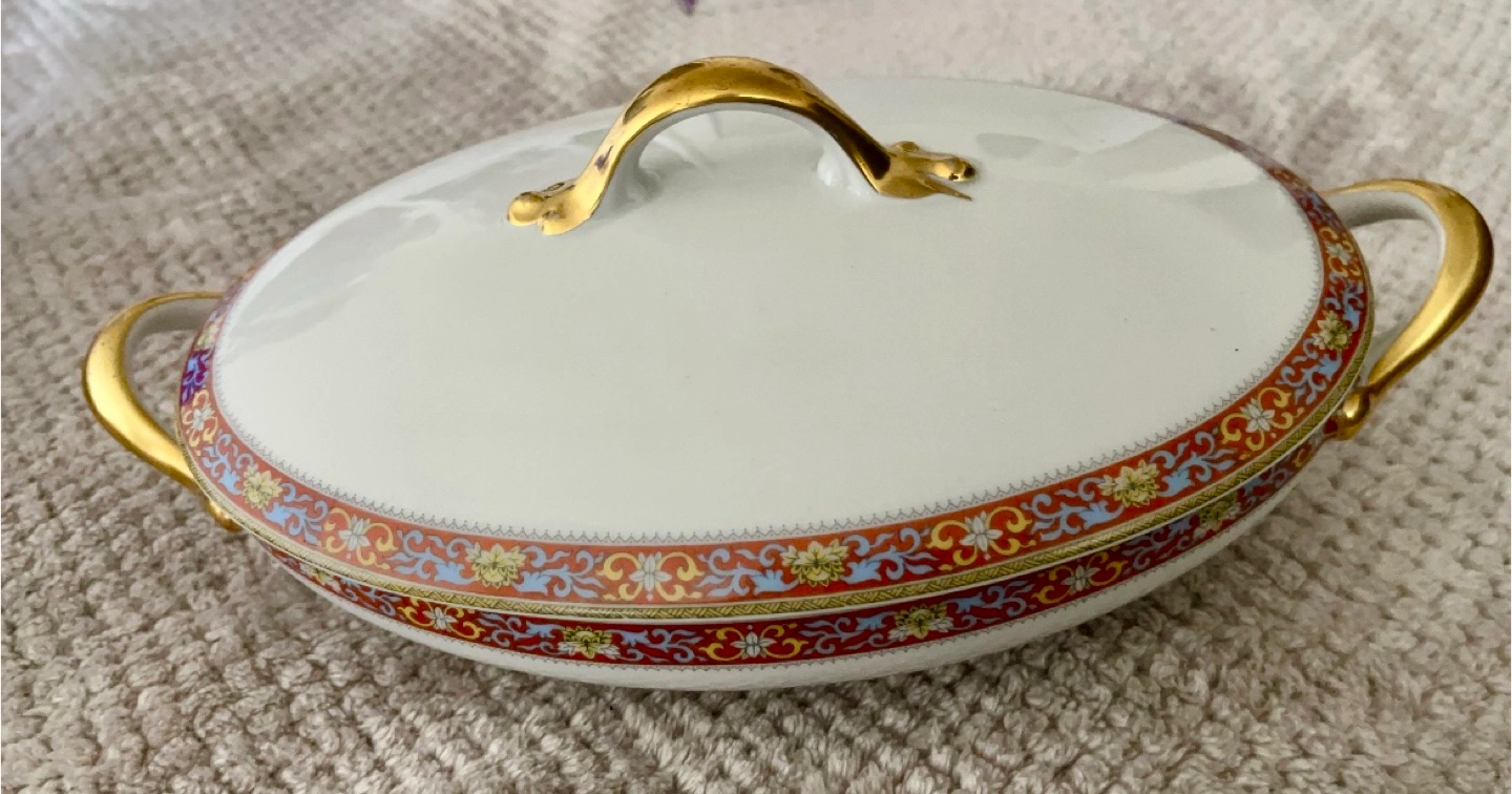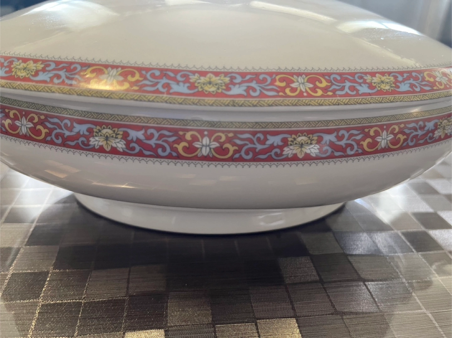 Oval dish with a lid. White porcelain with gold handles. A red and yellow floral pattern decorates the sides of the dish and lid. Using this dish will give you a peaceful moment to enjoy your meal.