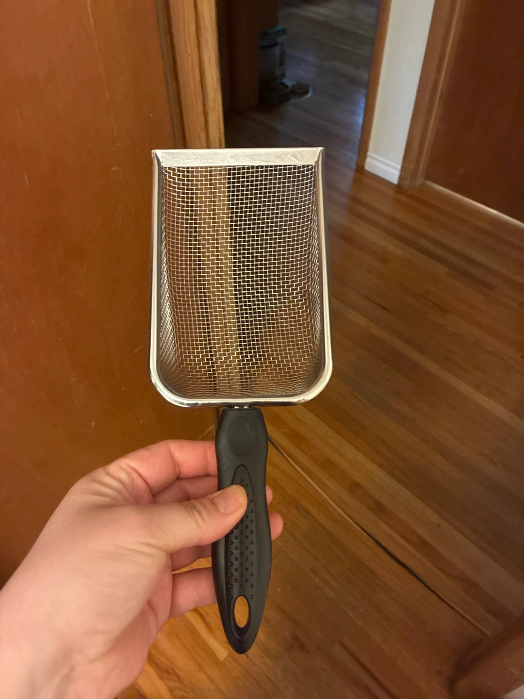 Metal mesh scoop with a black handle. Has a rectangular mesh head. The handle has an oval hole. Great for scooping any type of debris.brand new , mesh was to small for the job needed , could be used for garden sorting or maybe cat litter scooping