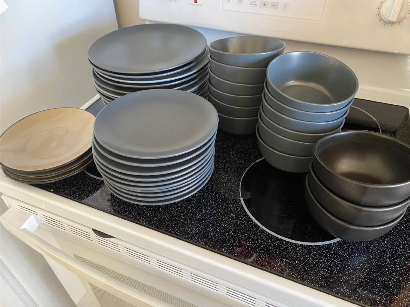 A dinnerware set featuring plates and bowls. Several stacks of light grey and dark grey and beige . A stack of grey and black bowls as well.