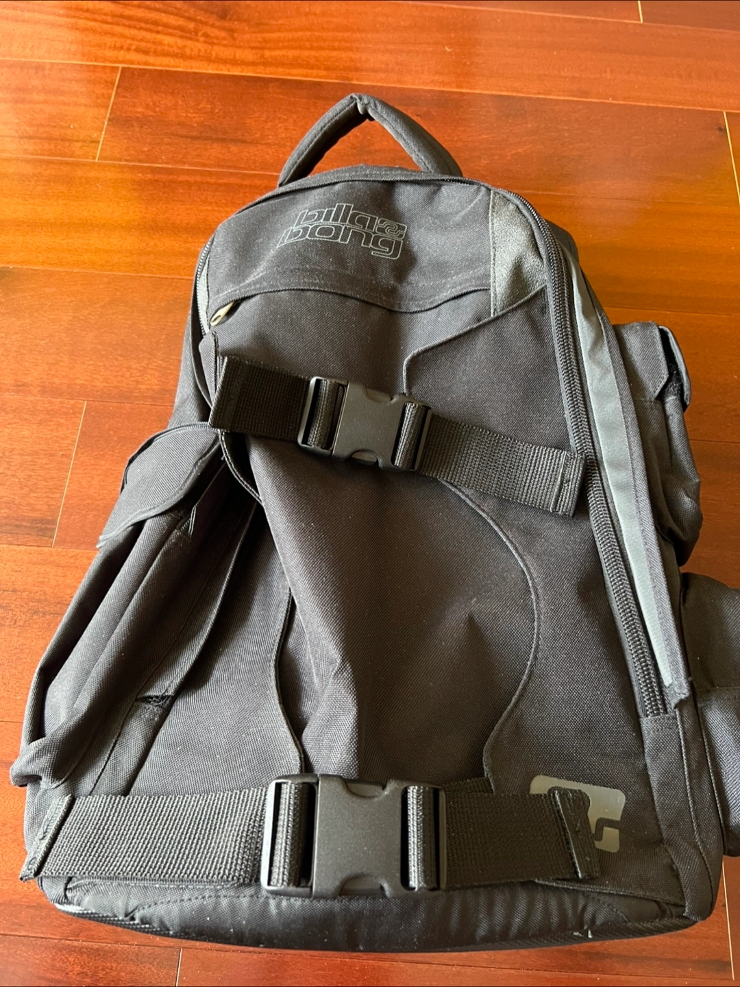 A Billabong heavy duty black backpack with multiple storage compartments. Features adjustable straps and buckles. You can use this backpack for everyday use, such as work, school, or travelling.