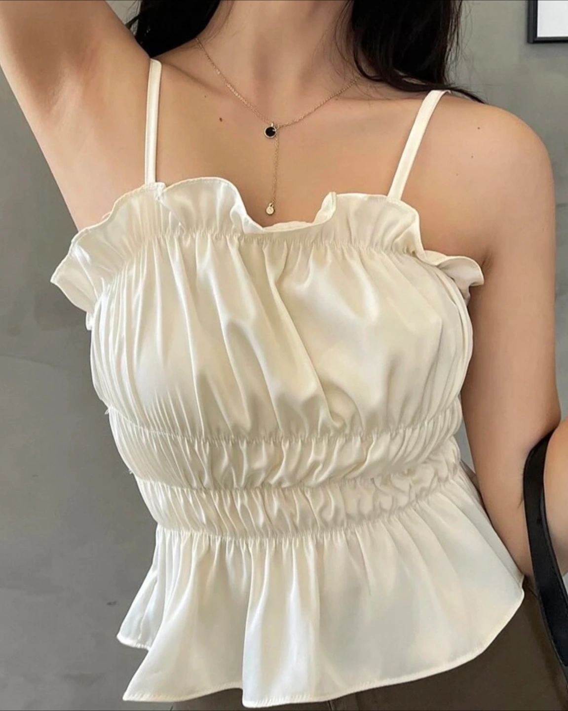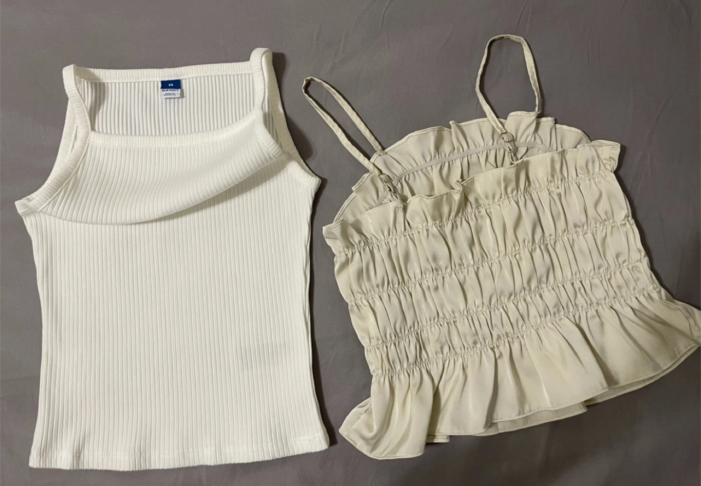 Perfect for a light and comfortable summer look. One is a ribbed tank. The other is a camisole top with ruffles and elastic detailing that gives it a unique touch, for a nice flow.