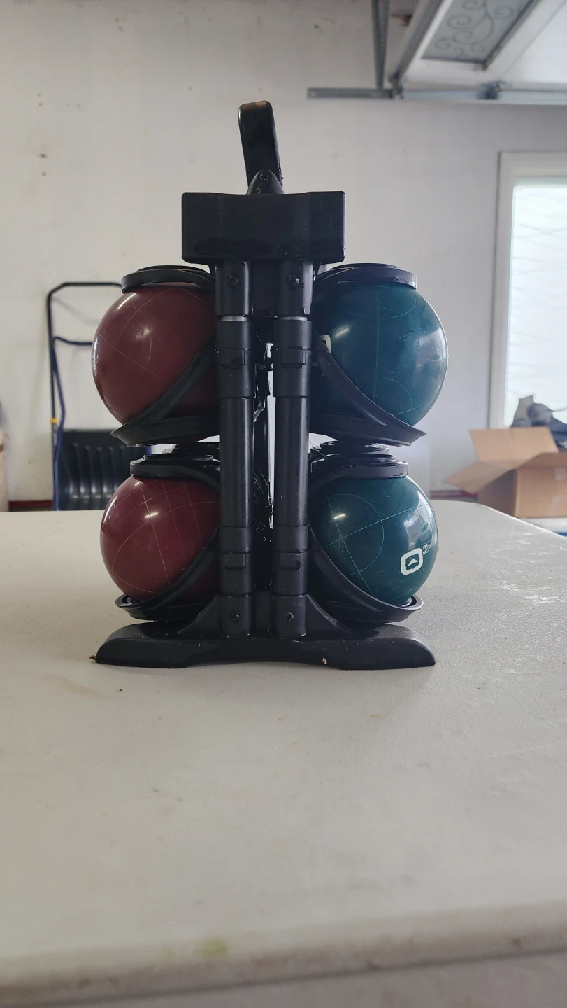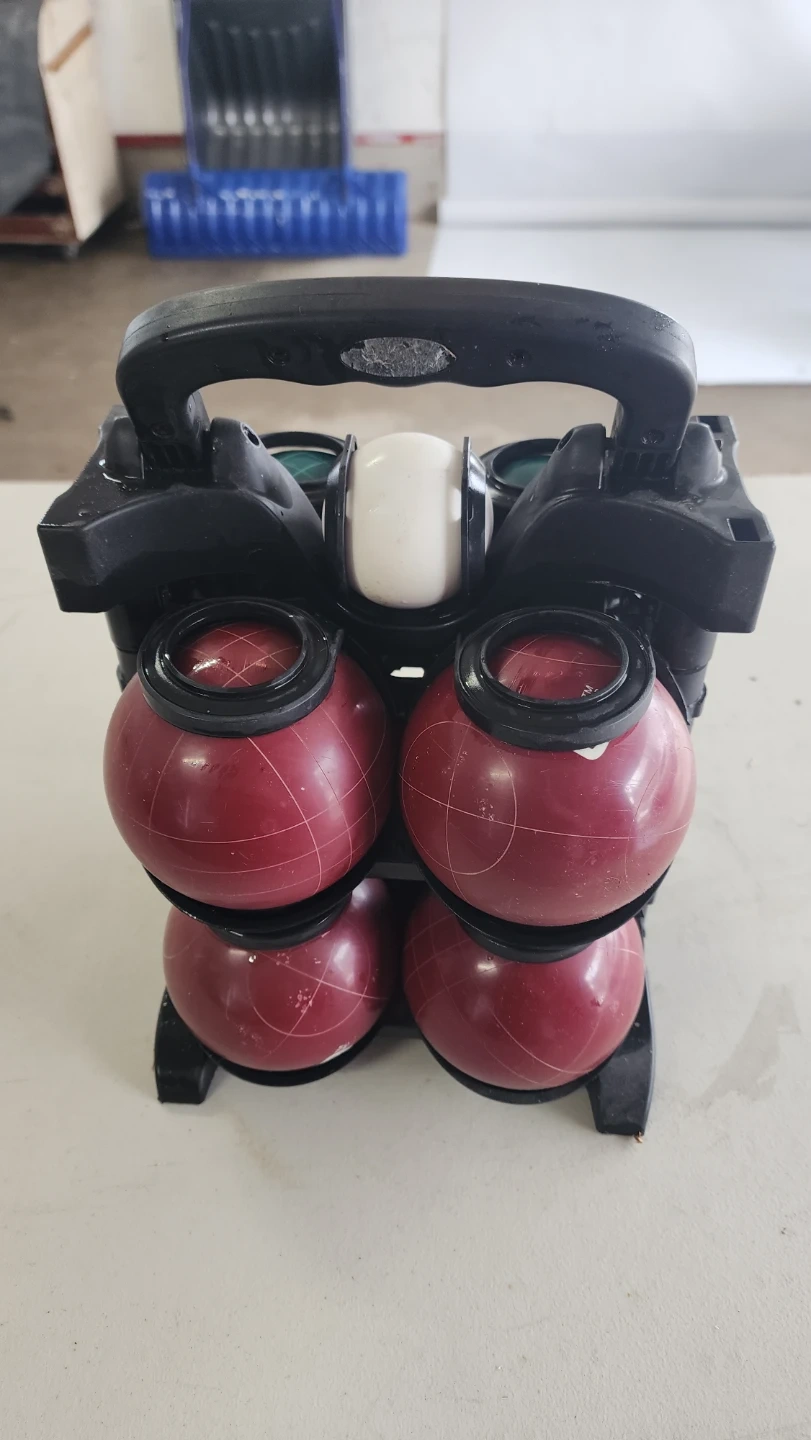 This set includes 8 bocce balls and 1 jack and the stabd to store and carry it all with ease. Four balls are green and four are red. It's perfect for backyard games or taking to the park. Get ready for some friendly competition! Brand new this set retails at Canadian Tire for $80.