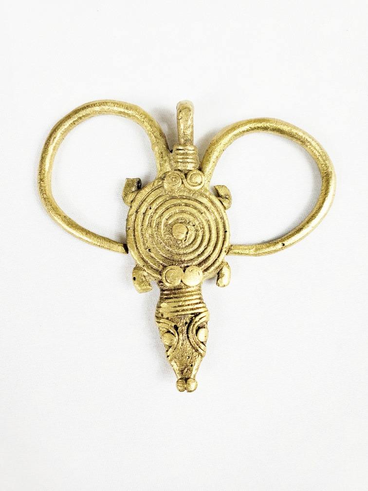 African Brass Pendant Jewelry with a unique design. Features a central creature and looped sides. A great addition to any collection or a lovely piece for everyday wear, adding a touch of character.