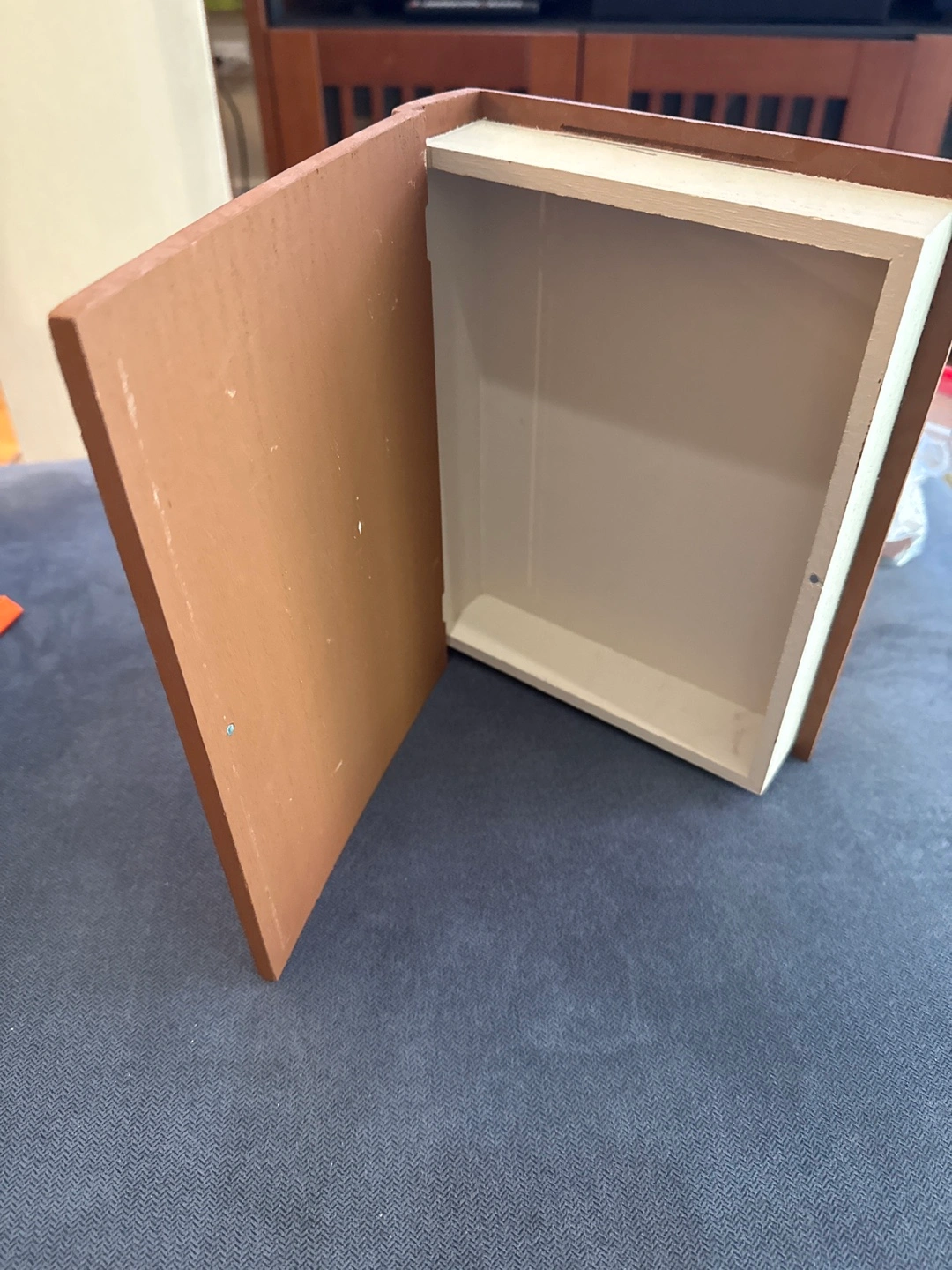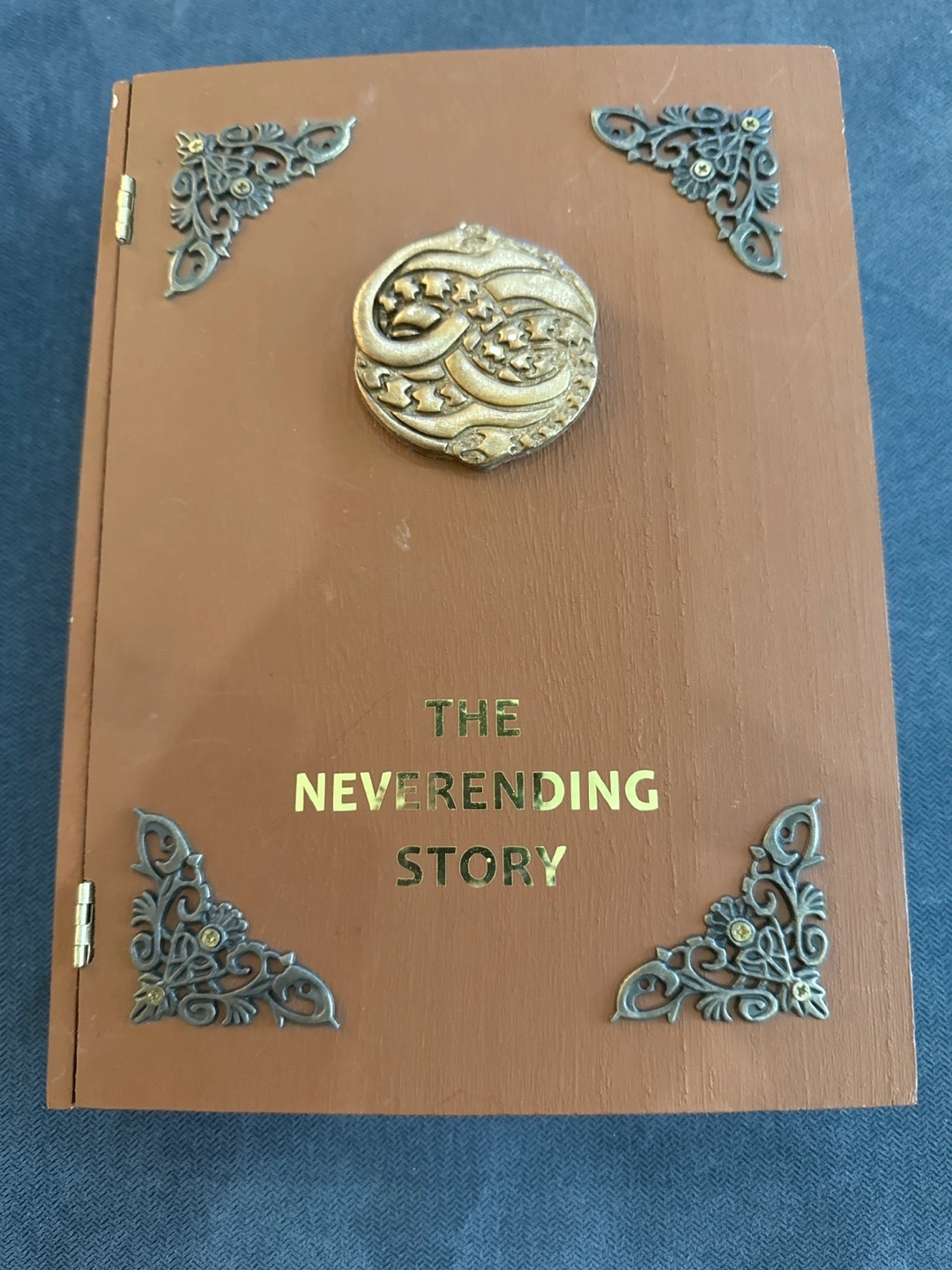 Decorative box in the shape of a book. It's made of wood. The cover features the title 'The Neverending Story'. This box is great for storing items that you would like to keep hidden.