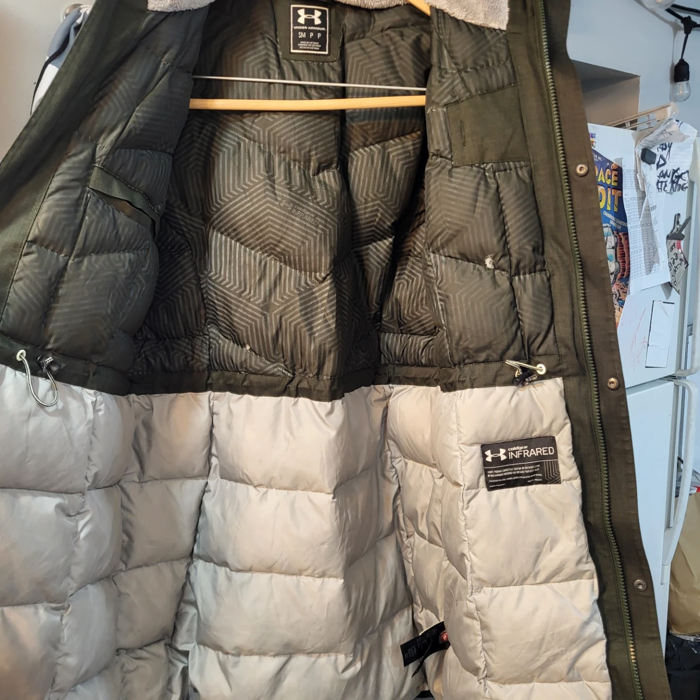 This Under Armour jacket is waterproof and windproof. It has multiple pockets and an adjustable hood. Great for staying dry during wet weather!