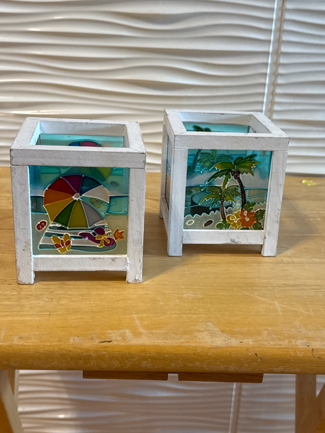 I'm selling a set of two decorative candle holders. They have a beach theme with palm trees and umbrellas. They are in good condition and would look great in any room