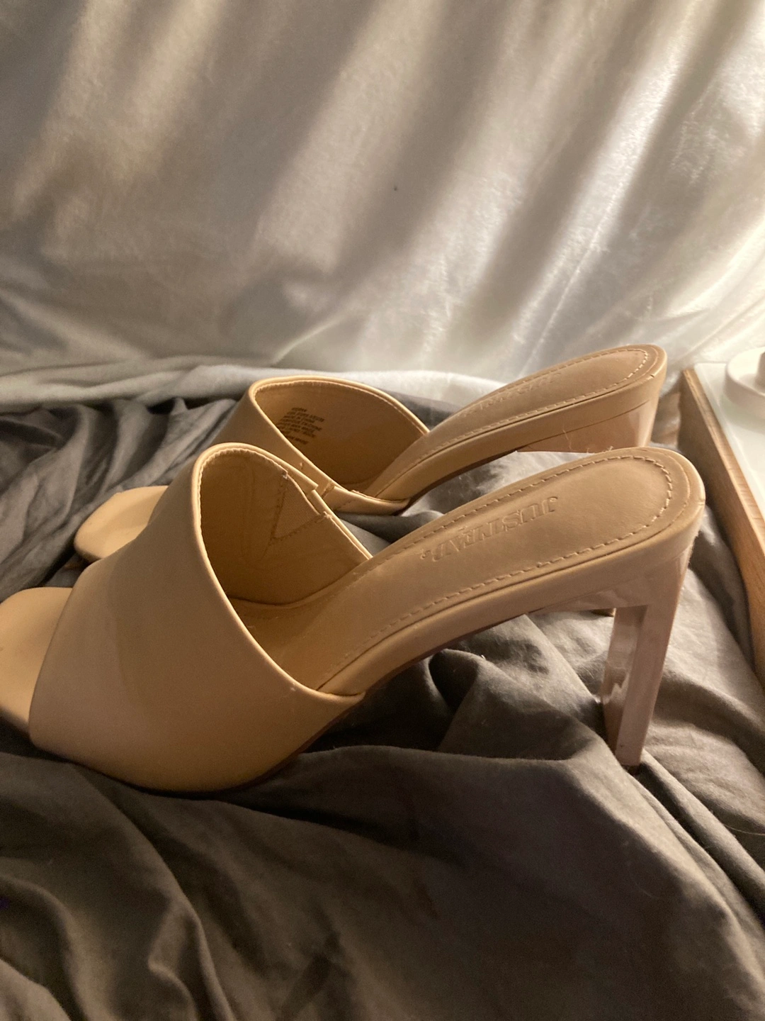 Heels in a neutral tone. Open-toe design. Low block heel. Consider these heels for a relaxing night out, perfect for adding a touch of elegance to your evening.