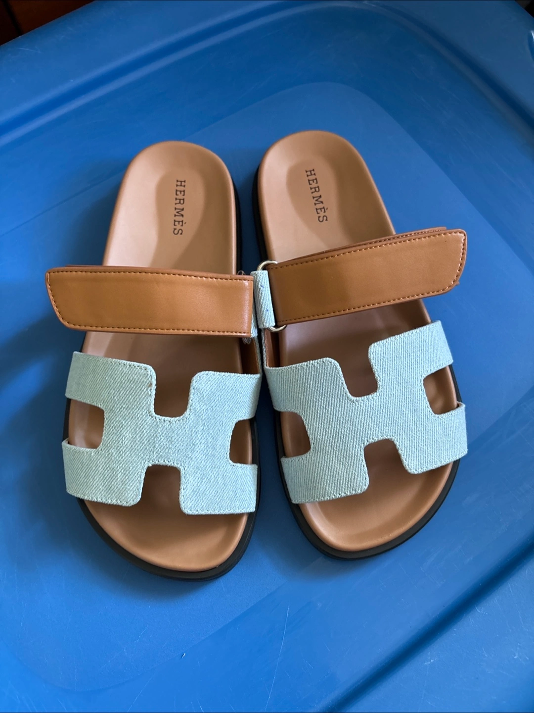 Sandals with an adjustable strap and a large H design. They have a brown footbed and base with a black outsole. A great purchase for summer. Front is light denim. Super chic, highest quality. Size 38 or 7.5. Not real. Come with box.