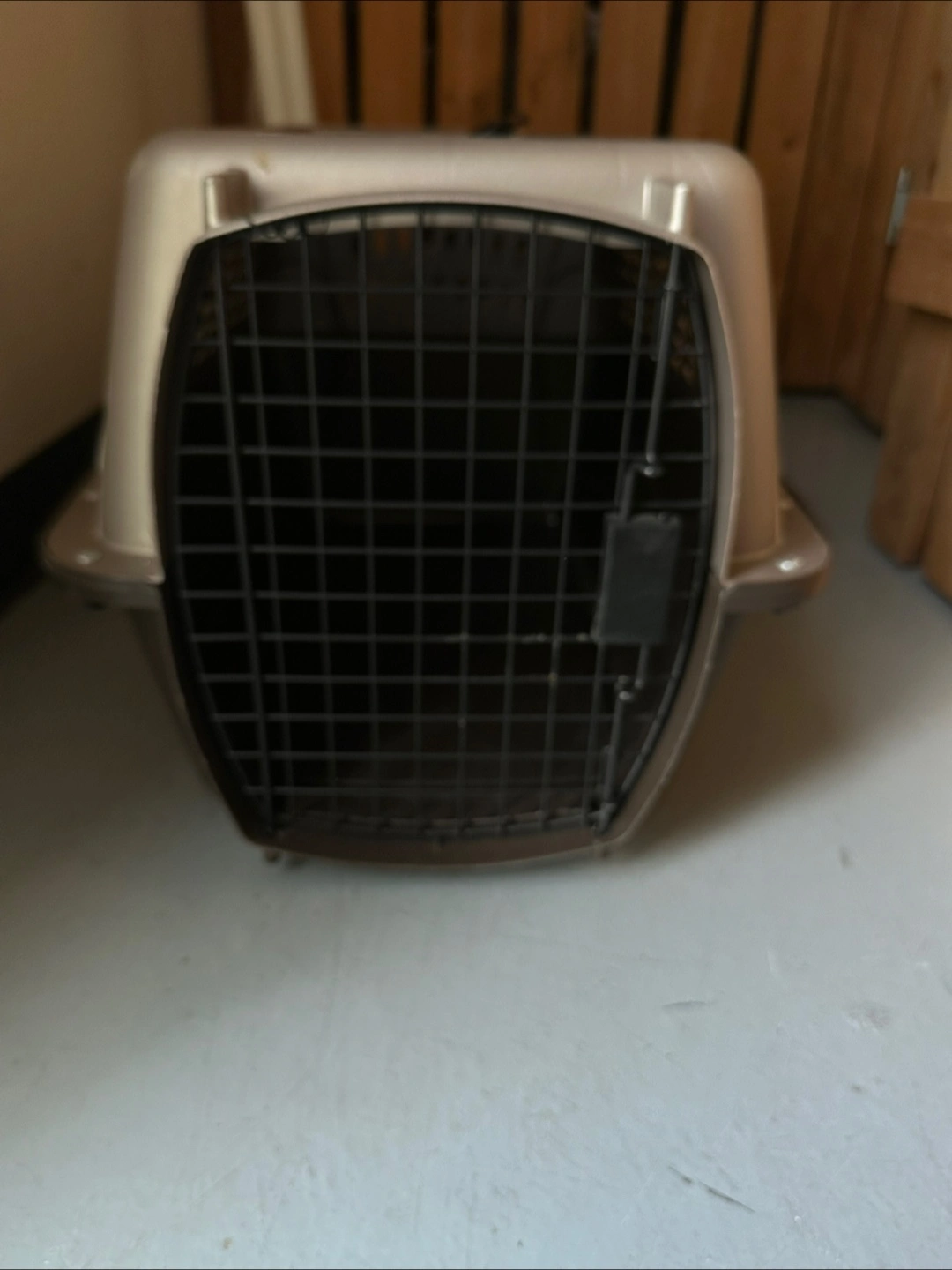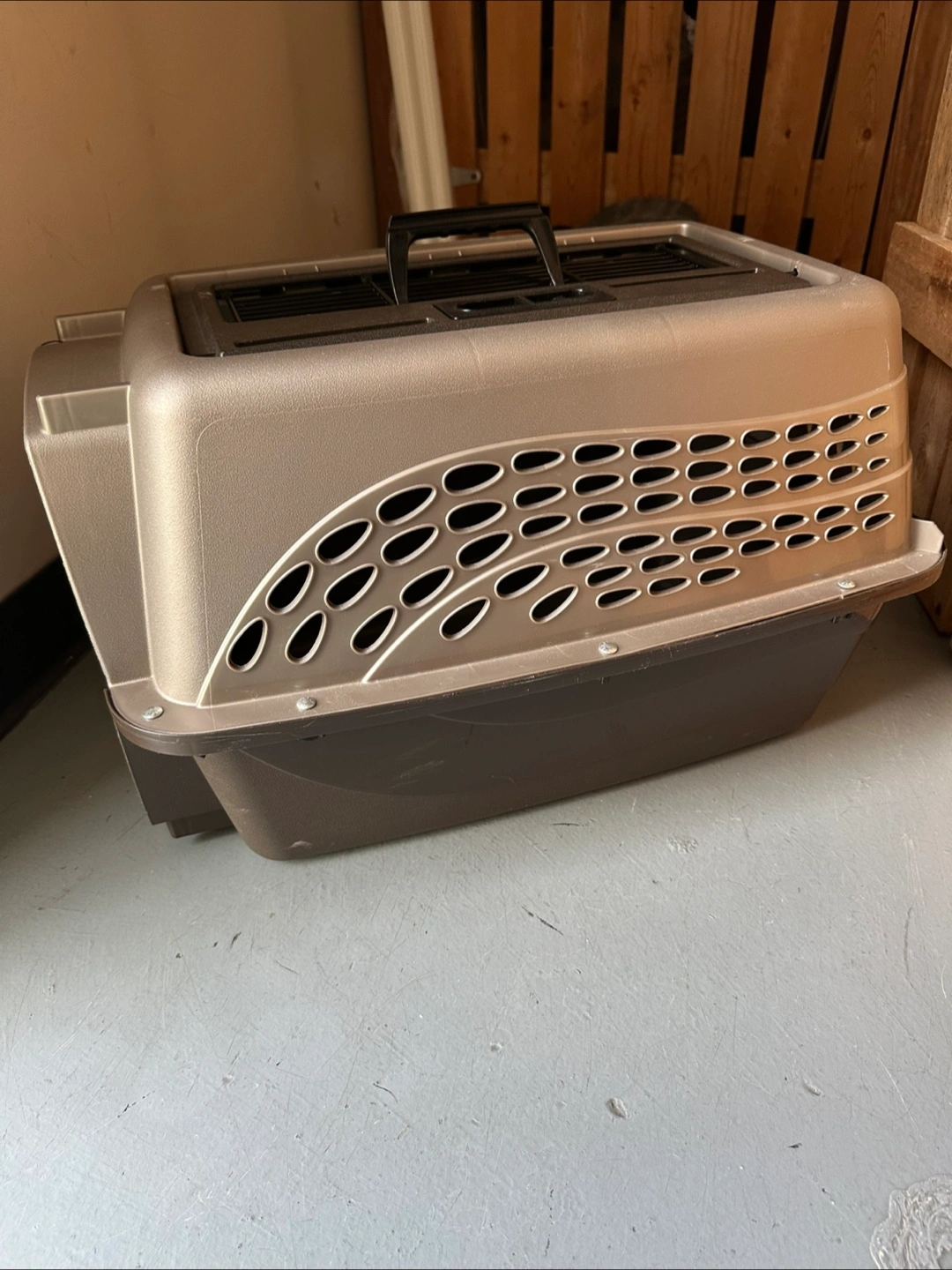 The pet carrier in neutral colors is designed for easy transport. Features a handle and a door with a secure latch. Ventilation openings along the sides, and on top. Providing your pet with a safe space for travel is very important. In better than good condition but I’ve had it in storage a while so it’s not new.