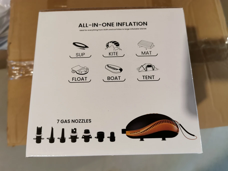 12V DC CAR CONNECTOR & FULL SET NOZZLES ATTACHMENTS - Connects to your car's 12V DC connector. Features a 12A fuse for increased safety. Electric sup air pump comes with 7 nozzles to fit most high pressure inflatables like stand up inflatable paddle boards, air beds, kayaks, boats, arch, swimming pools, tents and so on. Attention: If the nozzle is not suitable to your inflatables, you could try to change white gaskets.