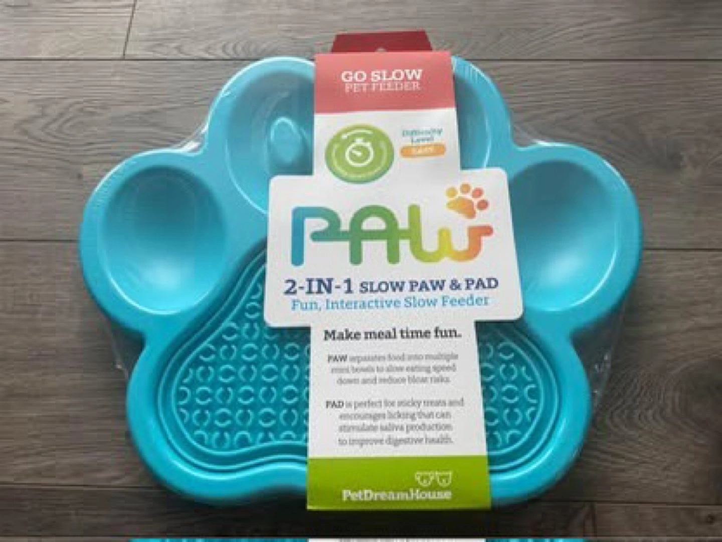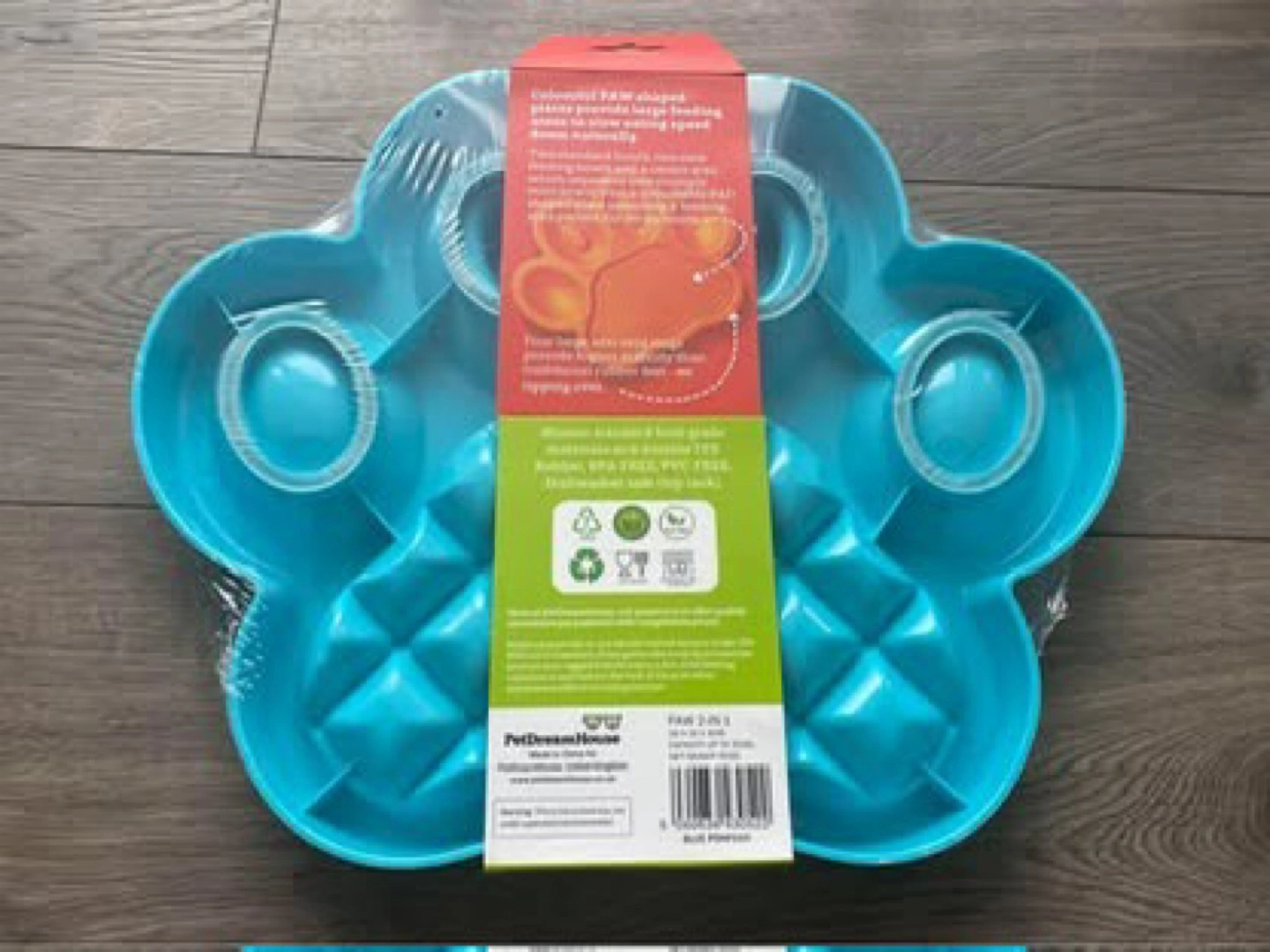 The pet feeder is shaped like a paw. It is blue in colour and is still in its packaging. You and your pet can both benefit from this item, so consider purchasing it. The item is designed with two sections, the first of which has small sections to slow down eating speed.