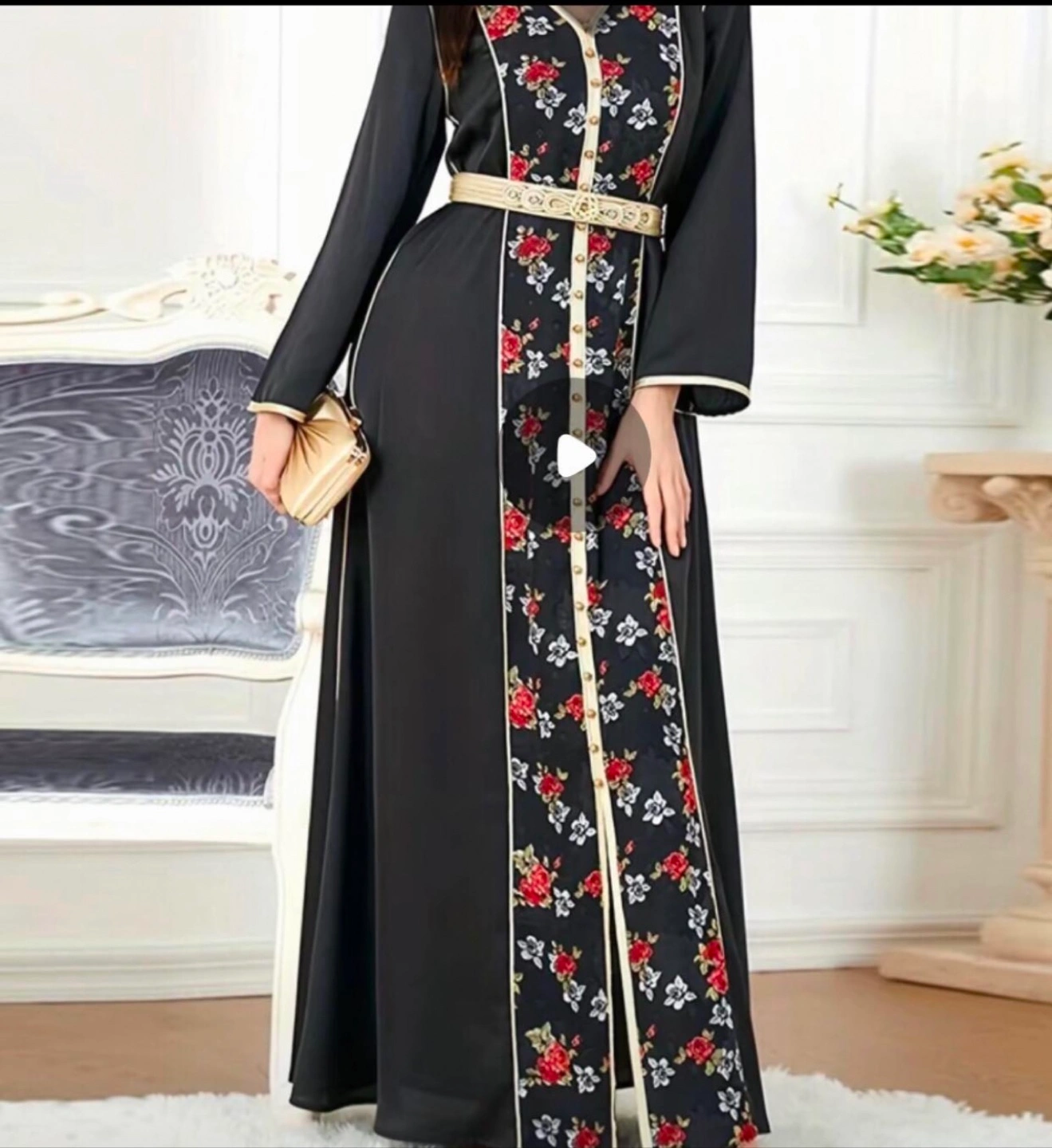 Long sleeve black dress. Features a floral print on the front. The dress has a belt and gold accents. You could wear this dress to a special event.