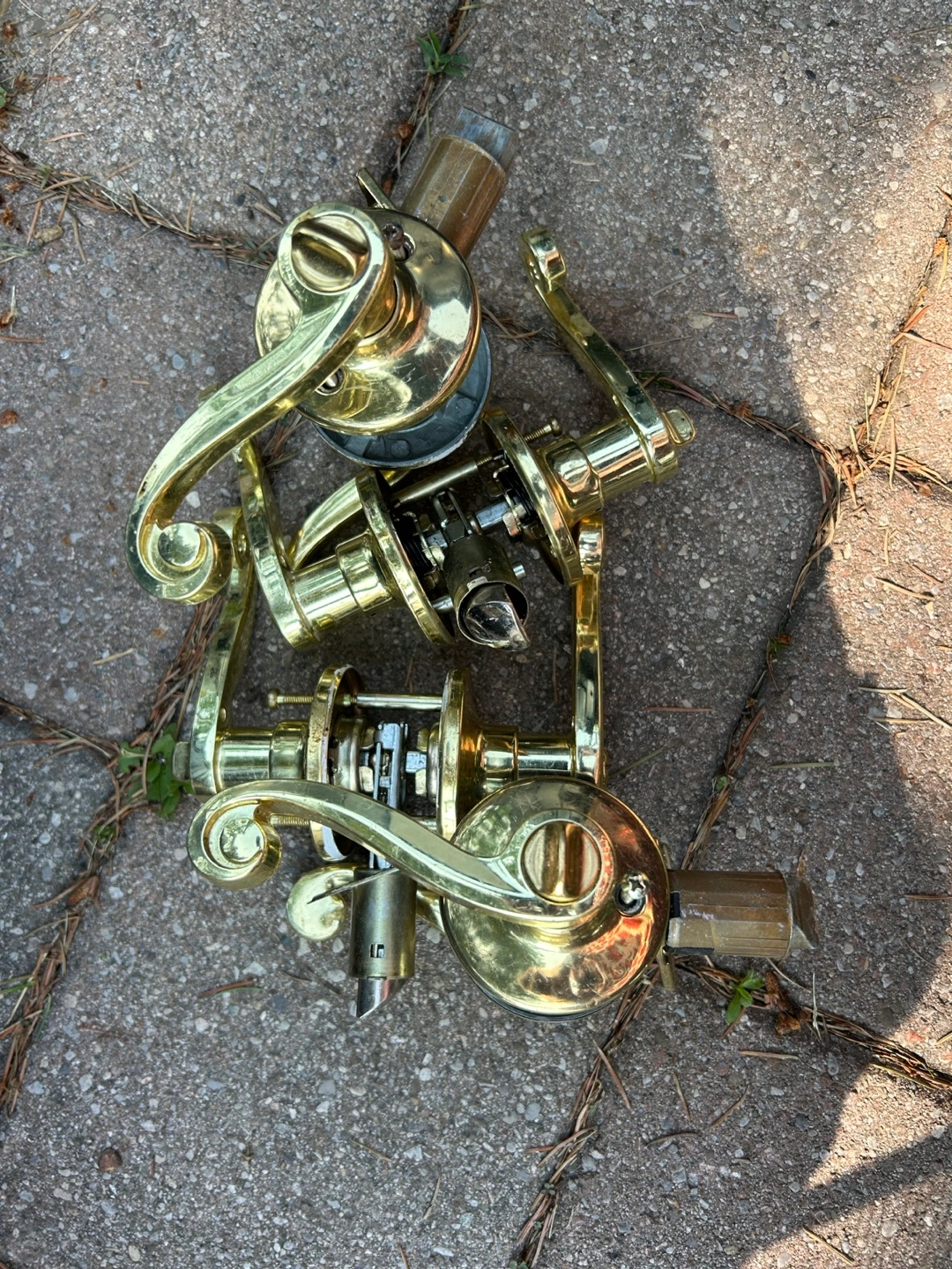A bundle of brass door handles. Some of the parts seem to be missing. Perfect for a renovation project where you can be creative with your home’s look, while feeling relaxed. 4 Privacy locks $15 each