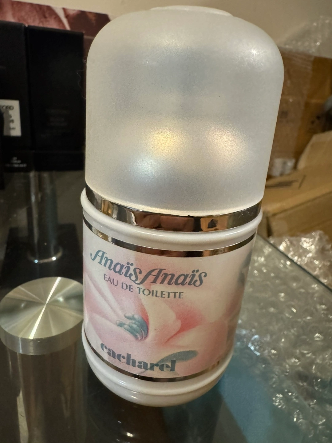 A beautiful perfume bottle. Features a frosted glass top. The base appears to be ceramic. The design features a delicate floral print. You can easily add this bottle to your collection.