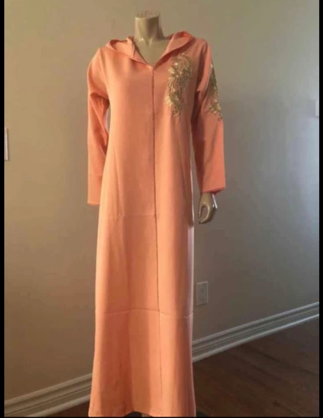 A long, peach-coloured dress with a hood. It features embroidery on the sleeves and chest area. You will feel relaxed in this comfortable outfit.