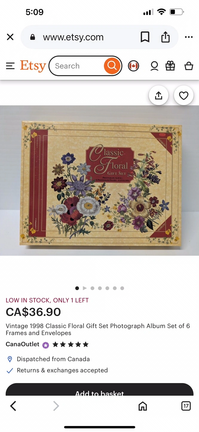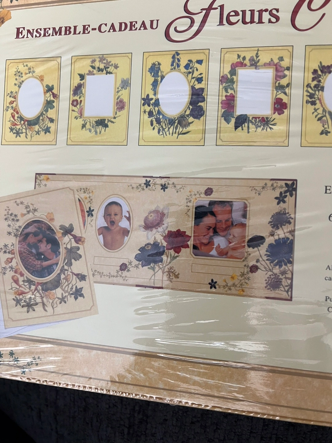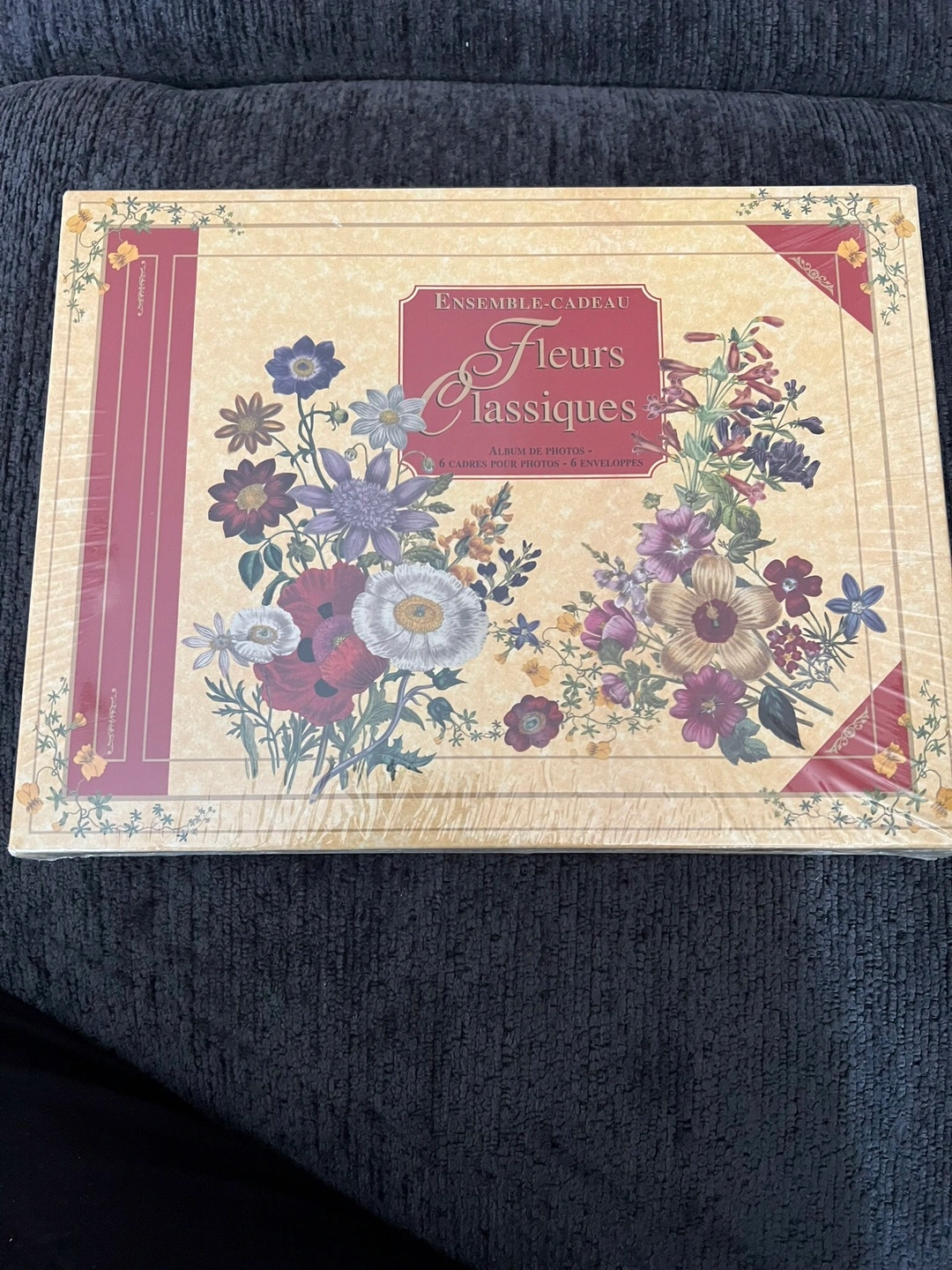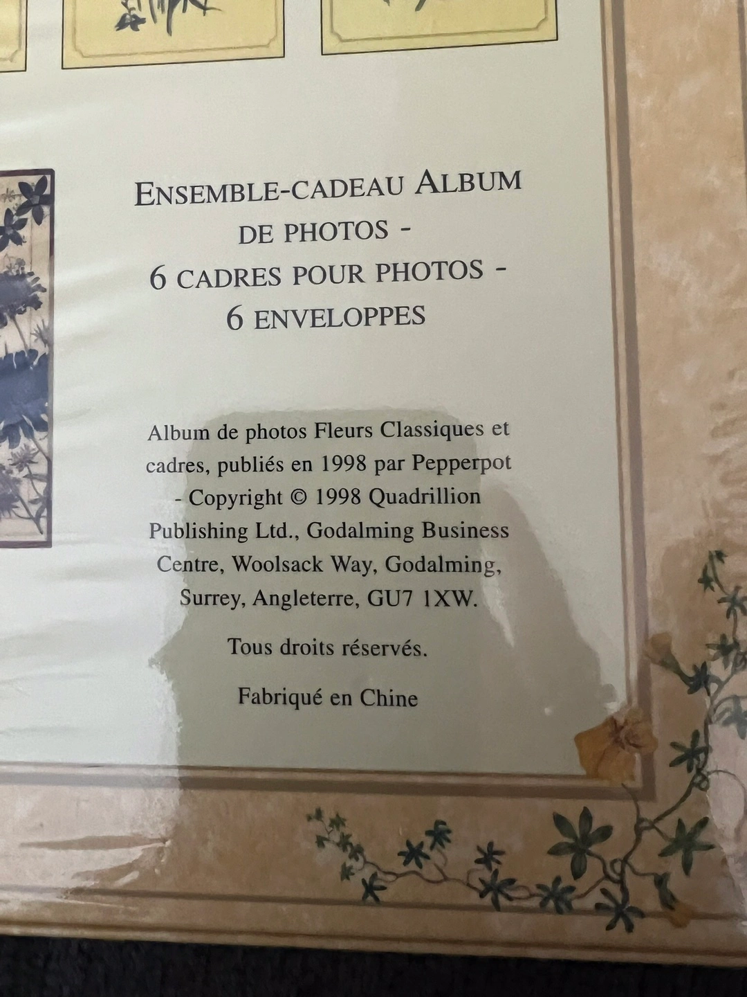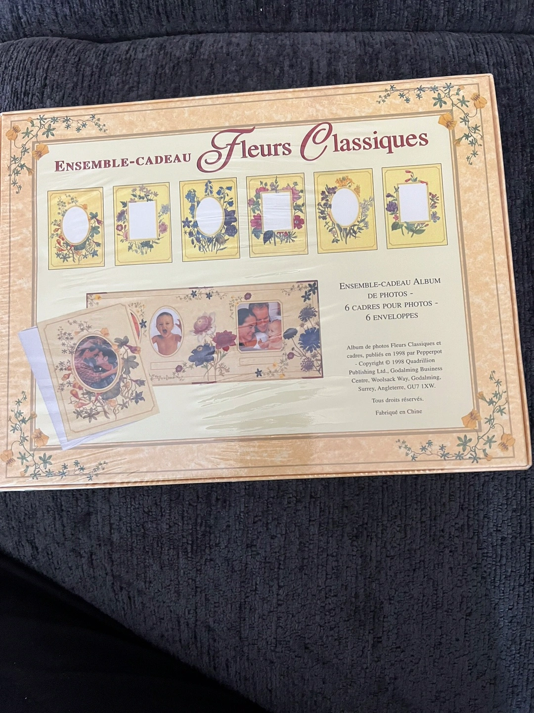 12A vintage photo album with matching frames and envelopes. Features a floral design. Keep your favourite memories alive within its pages. Note still in original cellophane from 1998 and box is in French!
