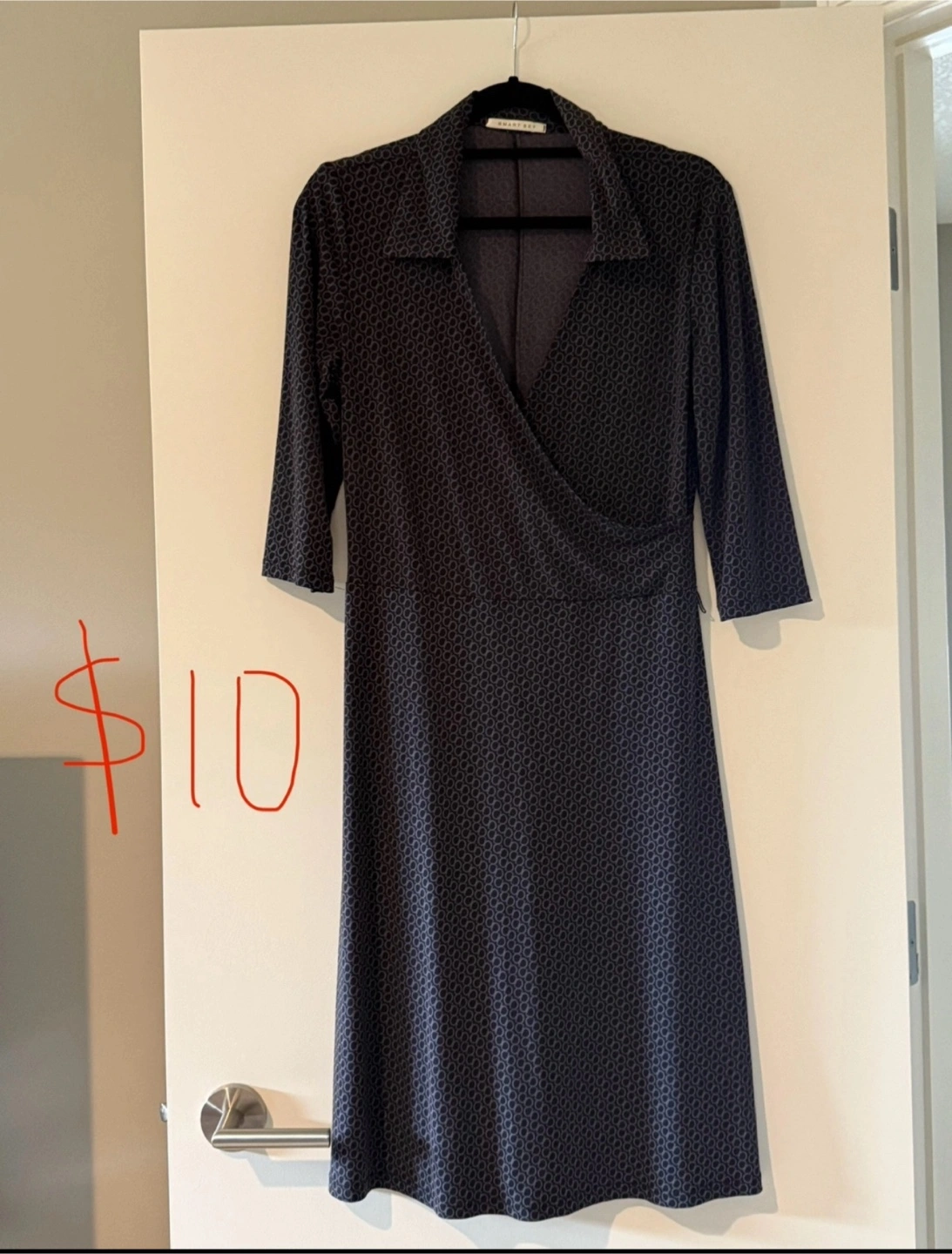 The dress has a lovely print and collar. The dress looks like it wraps in the front and has sleeves. A great dress for the office.
