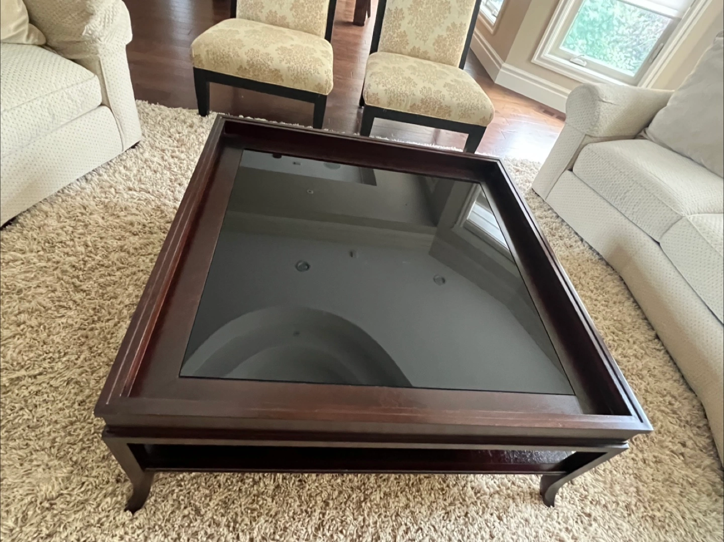 Solid wood coffee table. Square shape with a dark finish. A glass top insert, offering a reflective surface. You will find this table an ideal centre piece for the living room, a place to relax and enjoy your favourite book.