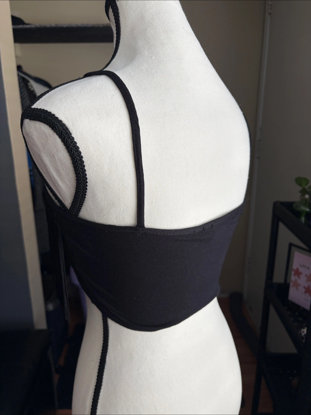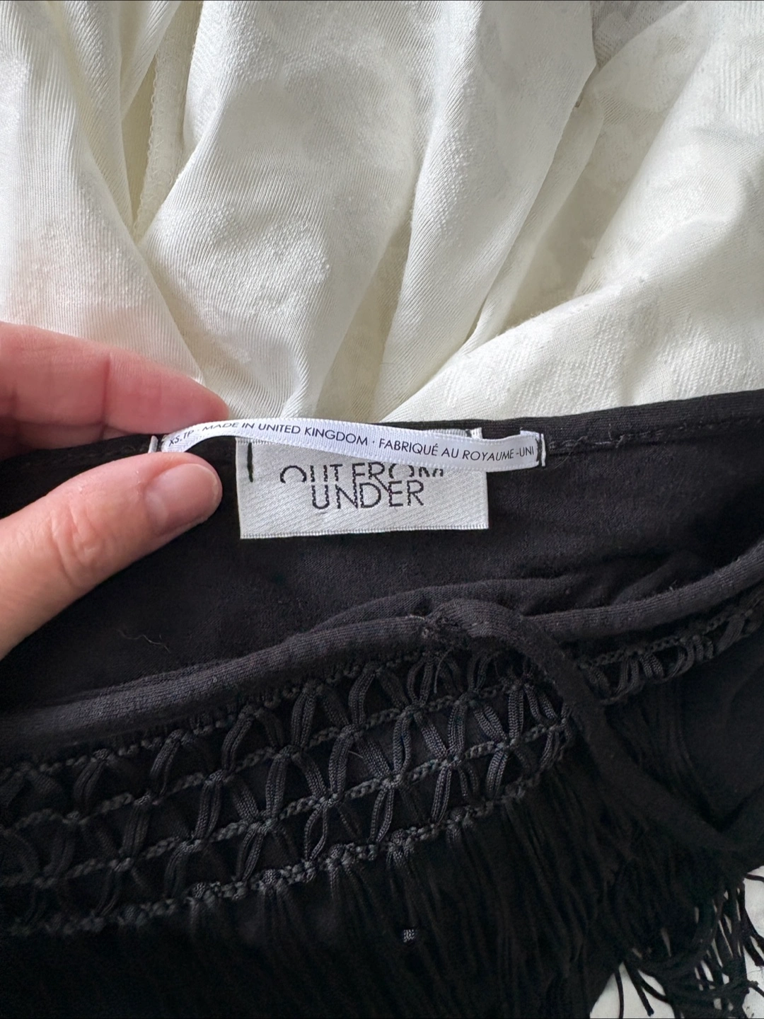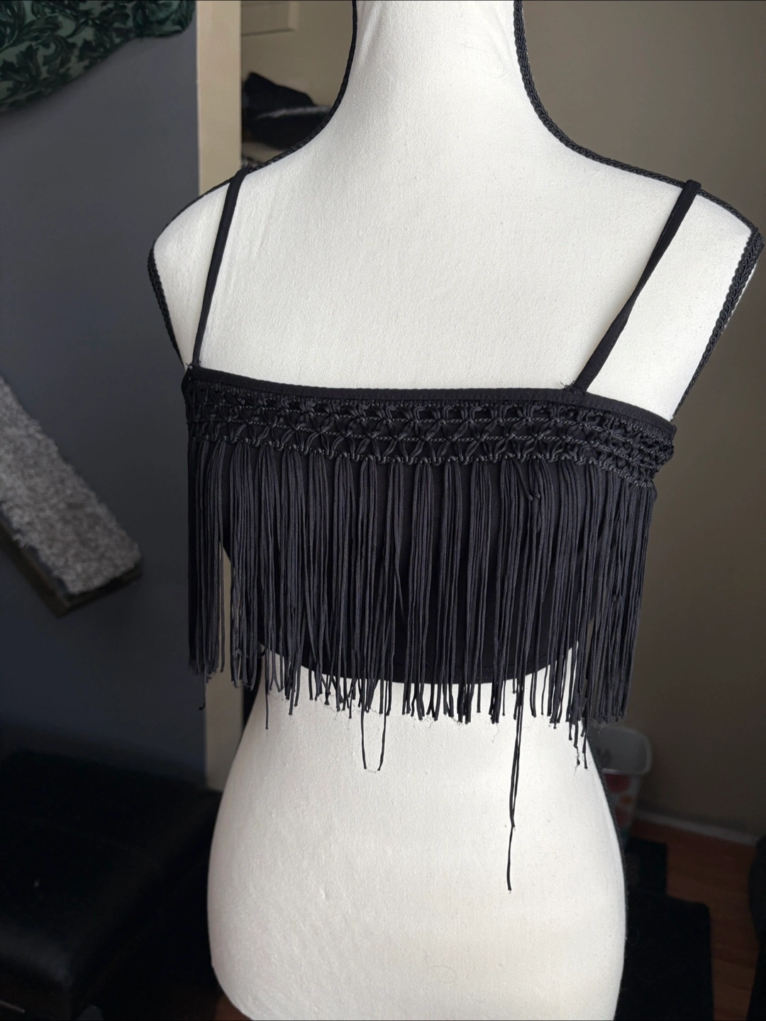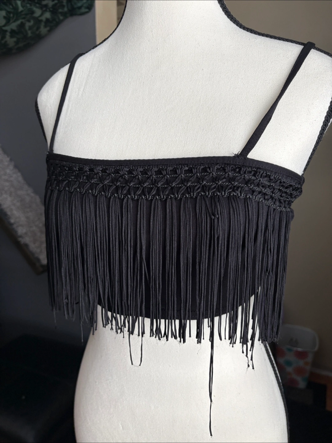 Black tank top from Urban Outfitters. features a sleeveless design with a chic crop cut. The top is embellished with a dramatic fringe detail that adds a bohemian flair, making it perfect for festival wear or casual outings.