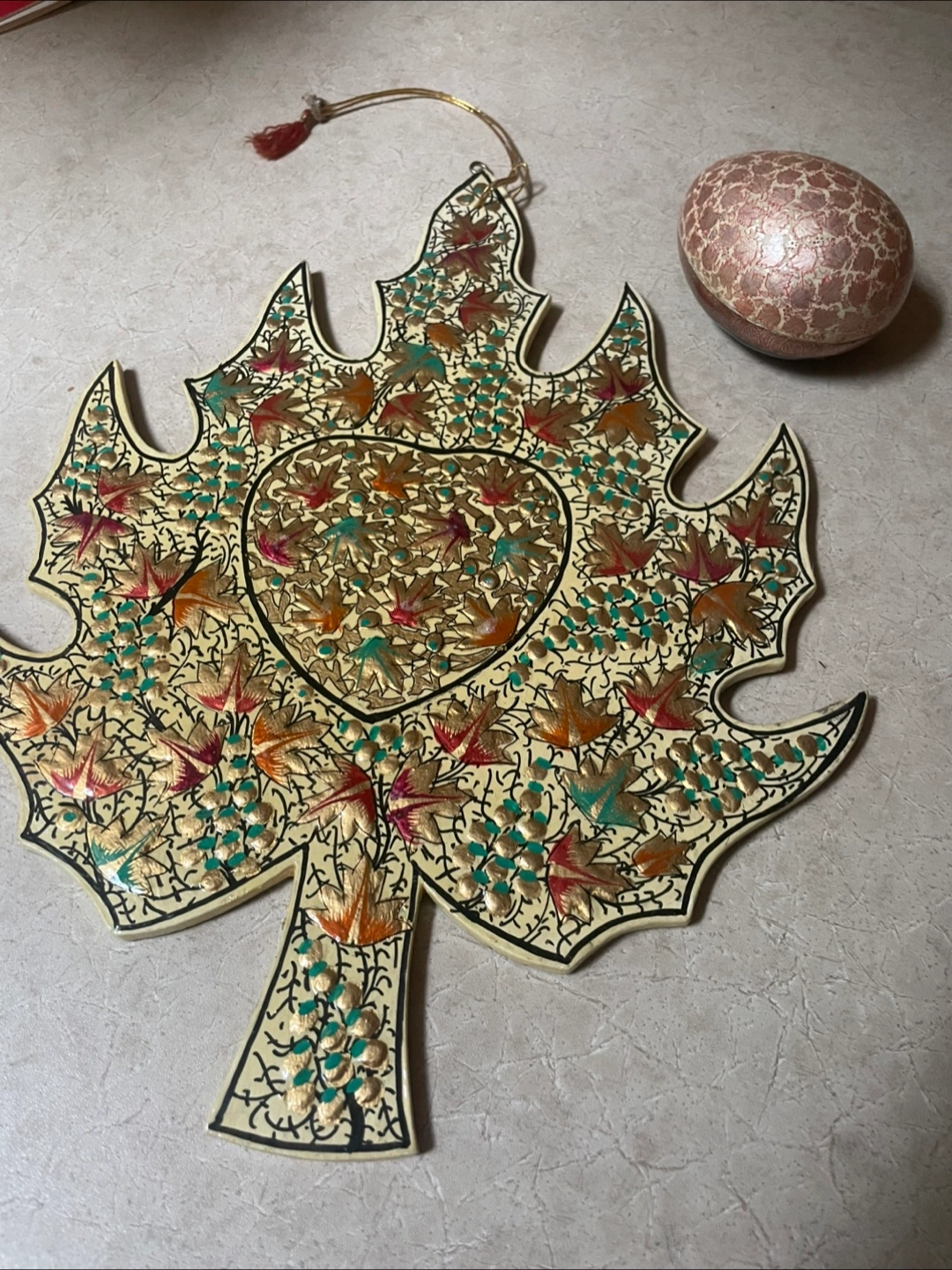 Kashmiri leaf art and an egg-shaped appear are hand painted. They have a glossy black interior, with a creamy-beige outer rim. The leaf can be hung. They are the perfect place to store small treasures or trinkets, creating a sense of tranquility.