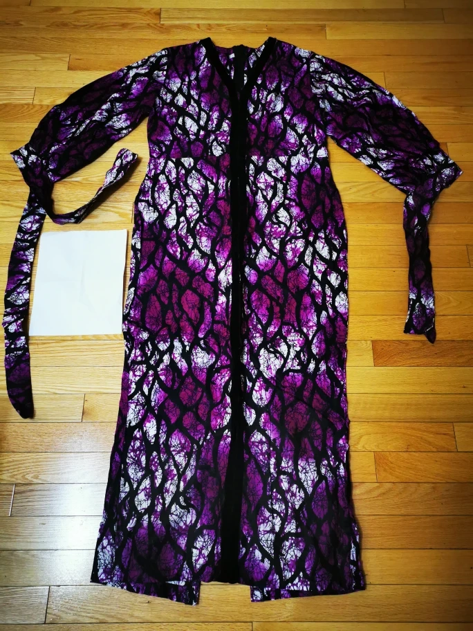 69I am selling a patterned maxi dress. It features long sleeves with ties at the cuffs. A belt is included to cinch the waist. The dress has a lovely purple pattern. Imagine wearing this dress while enjoying a quiet afternoon.