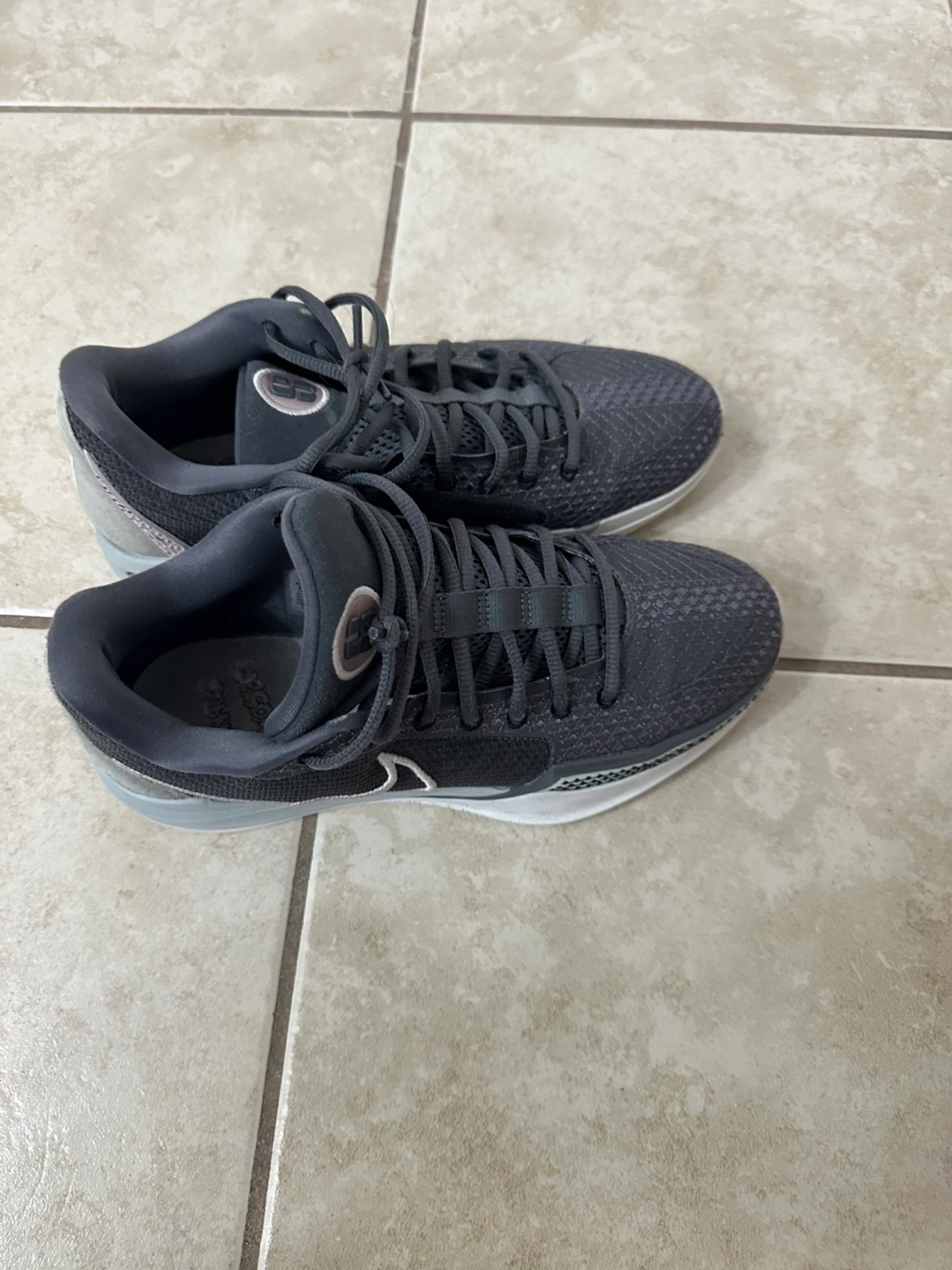 These grey sneakers are perfect for an everyday look. They feature laces, a textured upper, and a white sole with grey accents. With a swoosh on the side, and a padded collar.