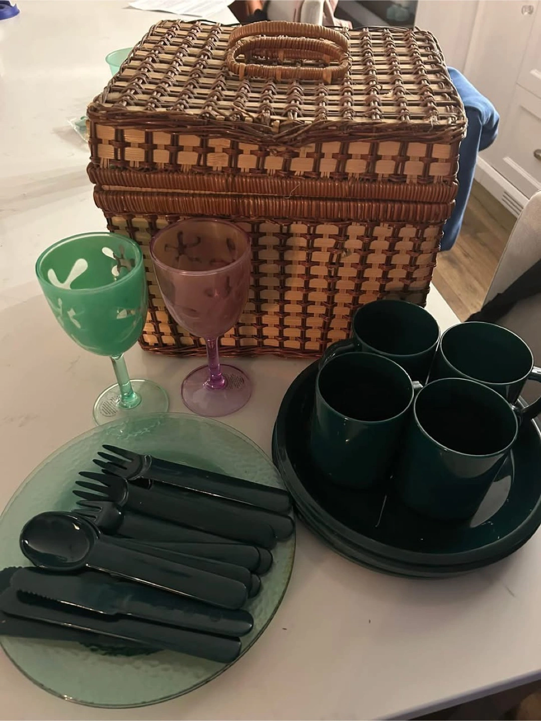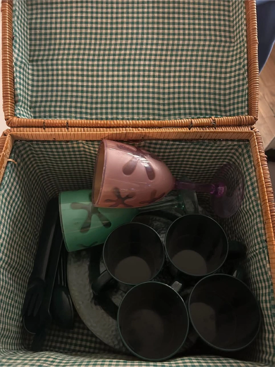 Wicker picnic basket with a gingham lining. Contains plates, cups, cutlery, and wine glasses. Perfect for enjoying a quiet afternoon outside.