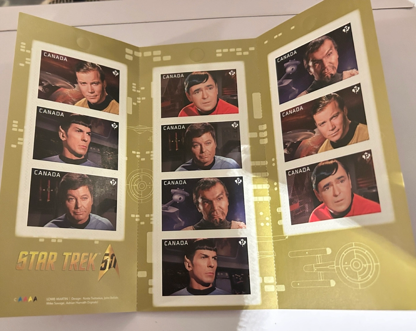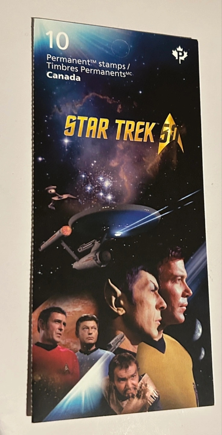 Stamps from Canada post commemorating the 50th anniversary of Star Trek. Features Spock, Kirk, McCoy, Scotty, and Kor the Klingon. A sheet of stamps, folded in a tri-fold. Feature photos of Star Trek characters. A great item for any collector. It's also in its original packaging.