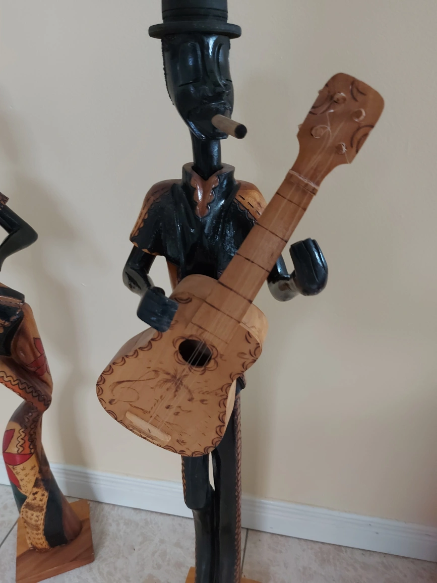 Selling a set of two hand-carved wooden figurines. One figurine has a guitar, the other has maracas. Both are painted in black and brown with intricate details. These figurines would be a great addition to any living room.