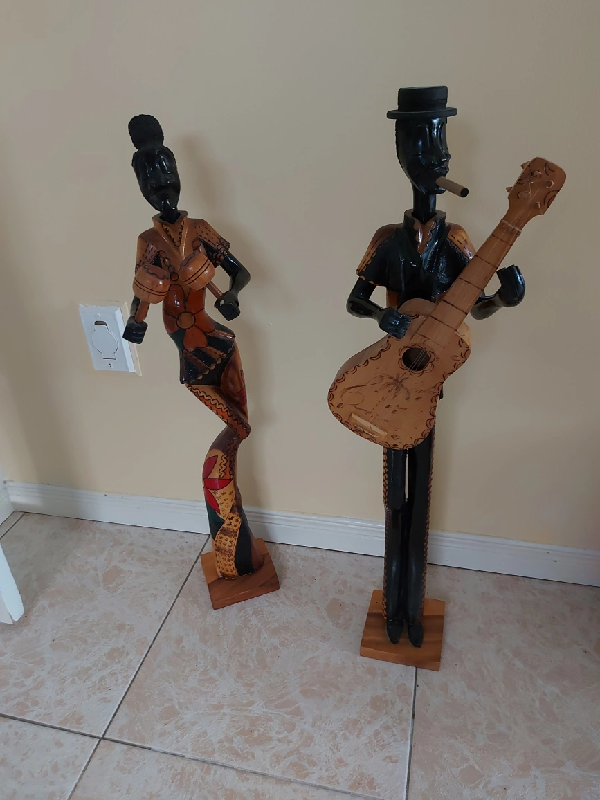 Selling a set of two hand-carved wooden figurines. One figurine has a guitar, the other has maracas. Both are painted in black and brown with intricate details. These figurines would be a great addition to any living room.
