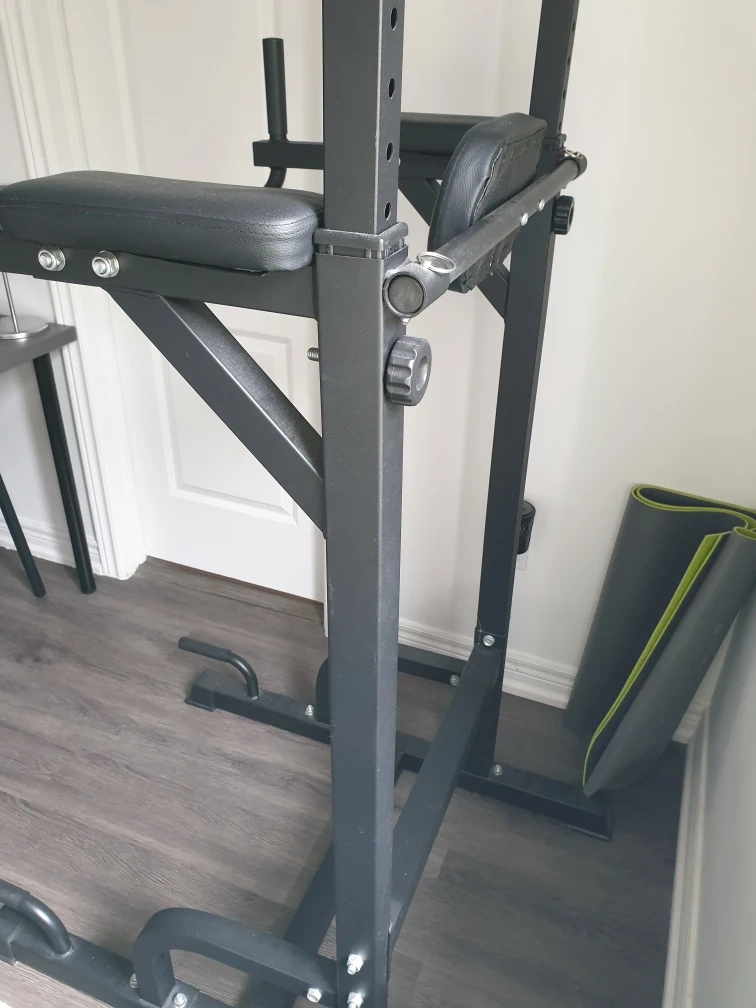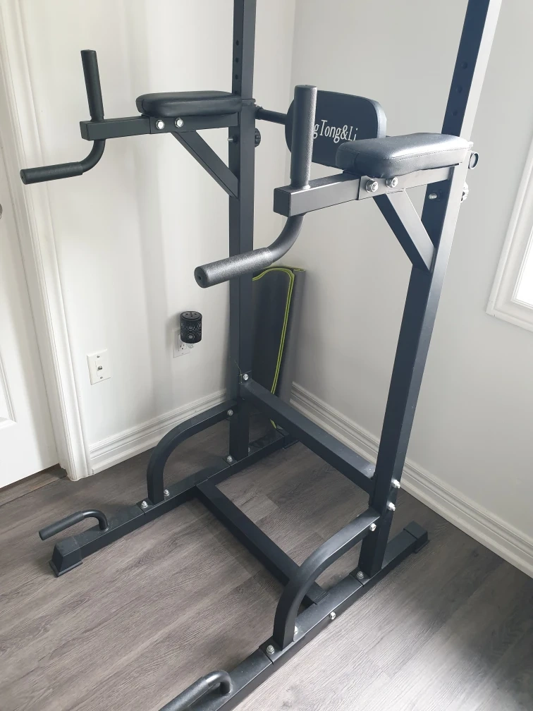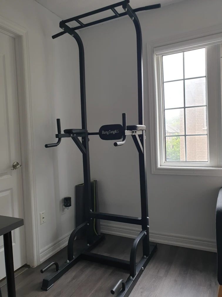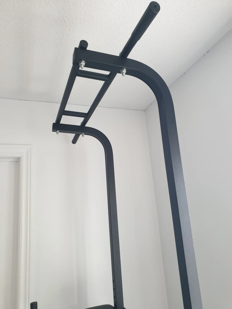 Sturdy fitness station in a black finish. Includes a pull up bar. Offers dip bars, arm rests for leg pull ups, and push up bars. Works back, chest, abs, biceps, and triceps.