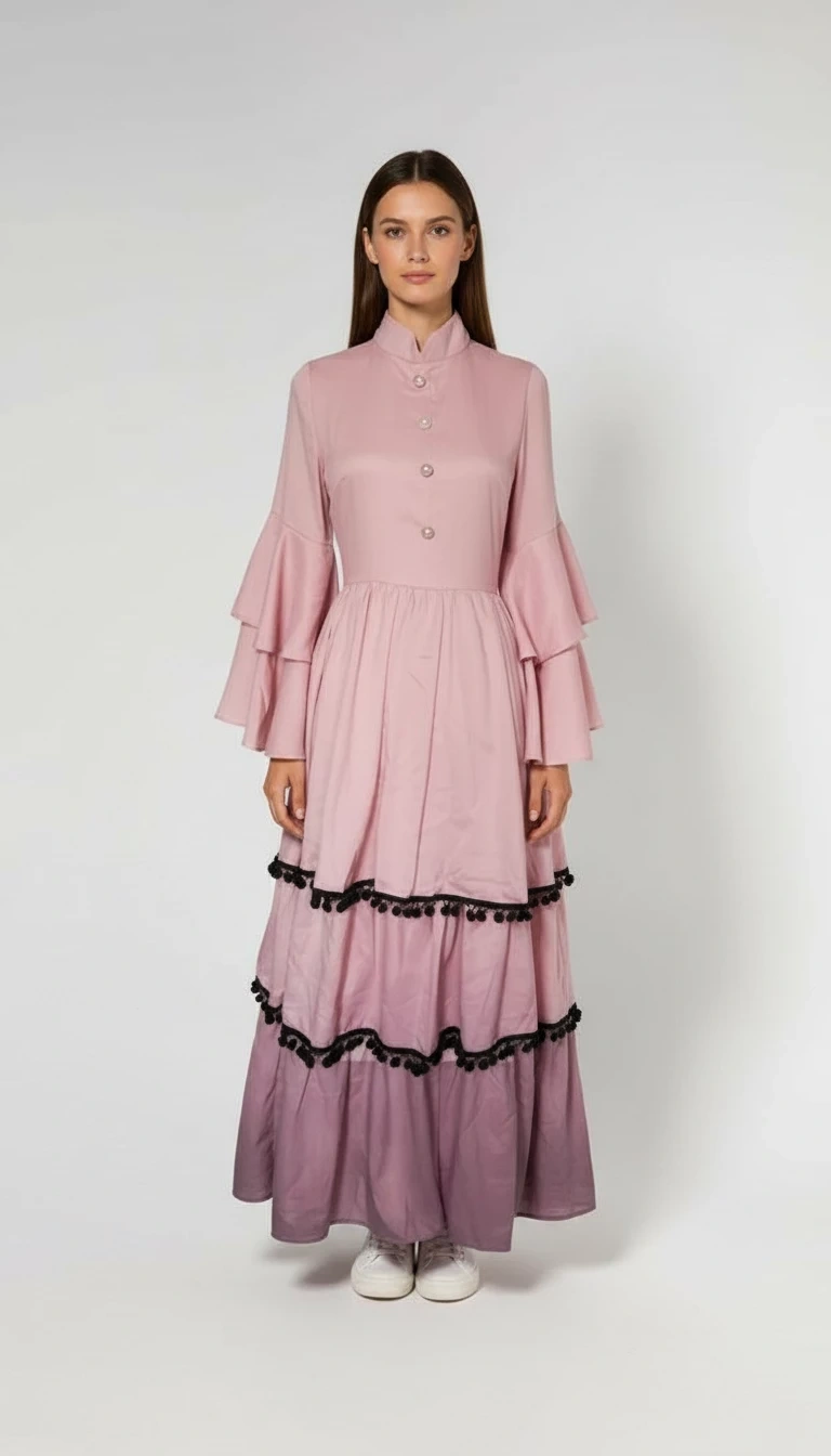 Brand new beautiful pink maxi dress features flounce sleeves, buttons front, black pom-pom trim and ruffle layered.