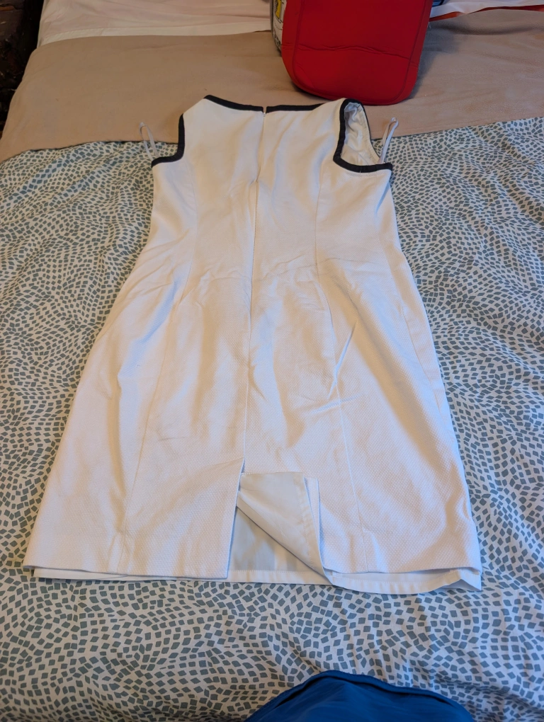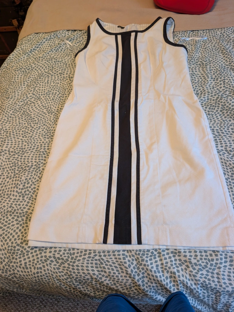 Sleeveless dress, featuring a white textured fabric. Has black trim on the edges and a central black stripe. A lovely dress to wear when you're looking for comfort.
