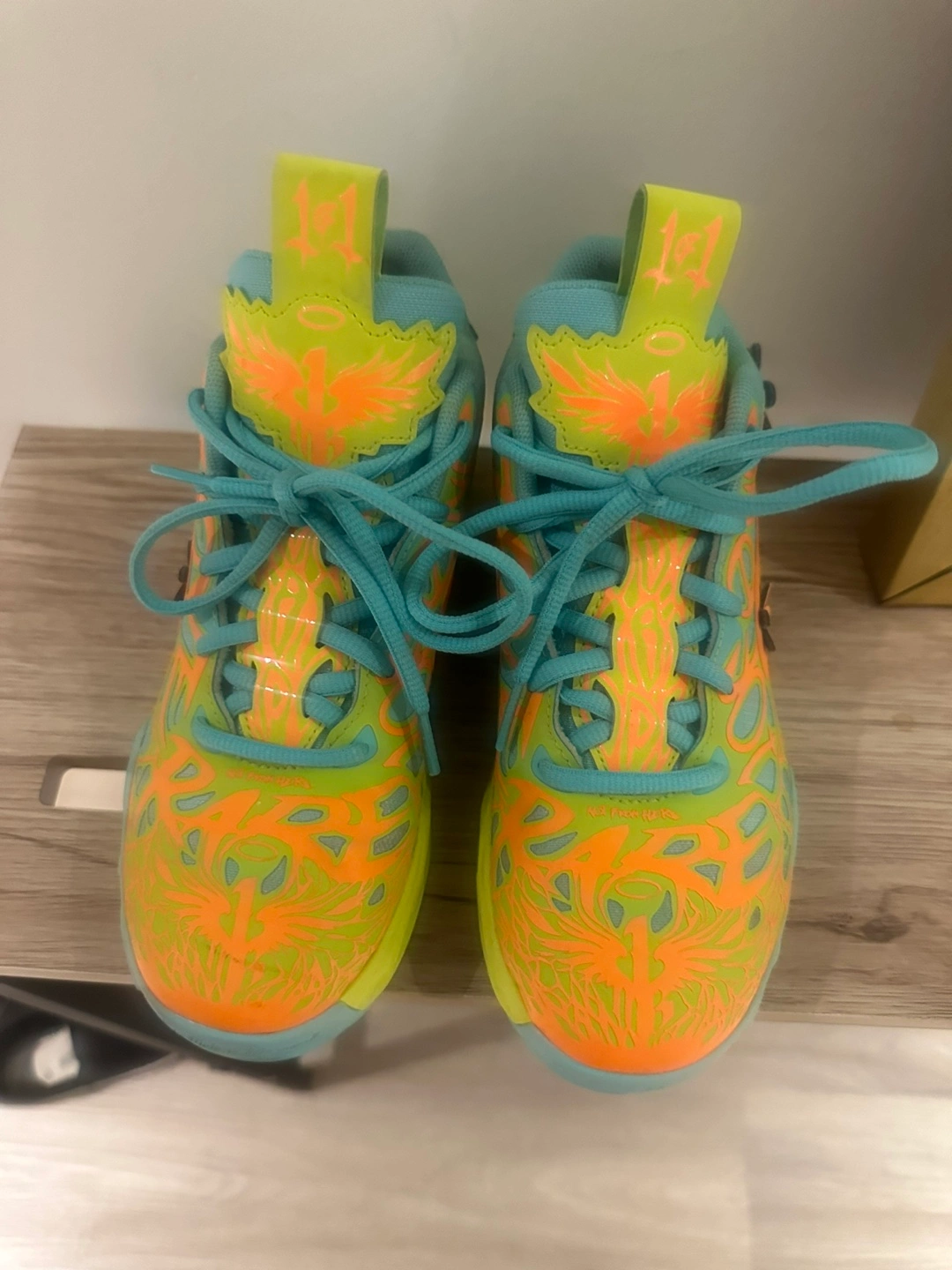 These vibrant sneakers are ready to go, perfect for a walk. These shoes are mostly orange and green. Featuring light blue laces. A great way to add some colour to your wardrobe.collab Scooby doo lemello