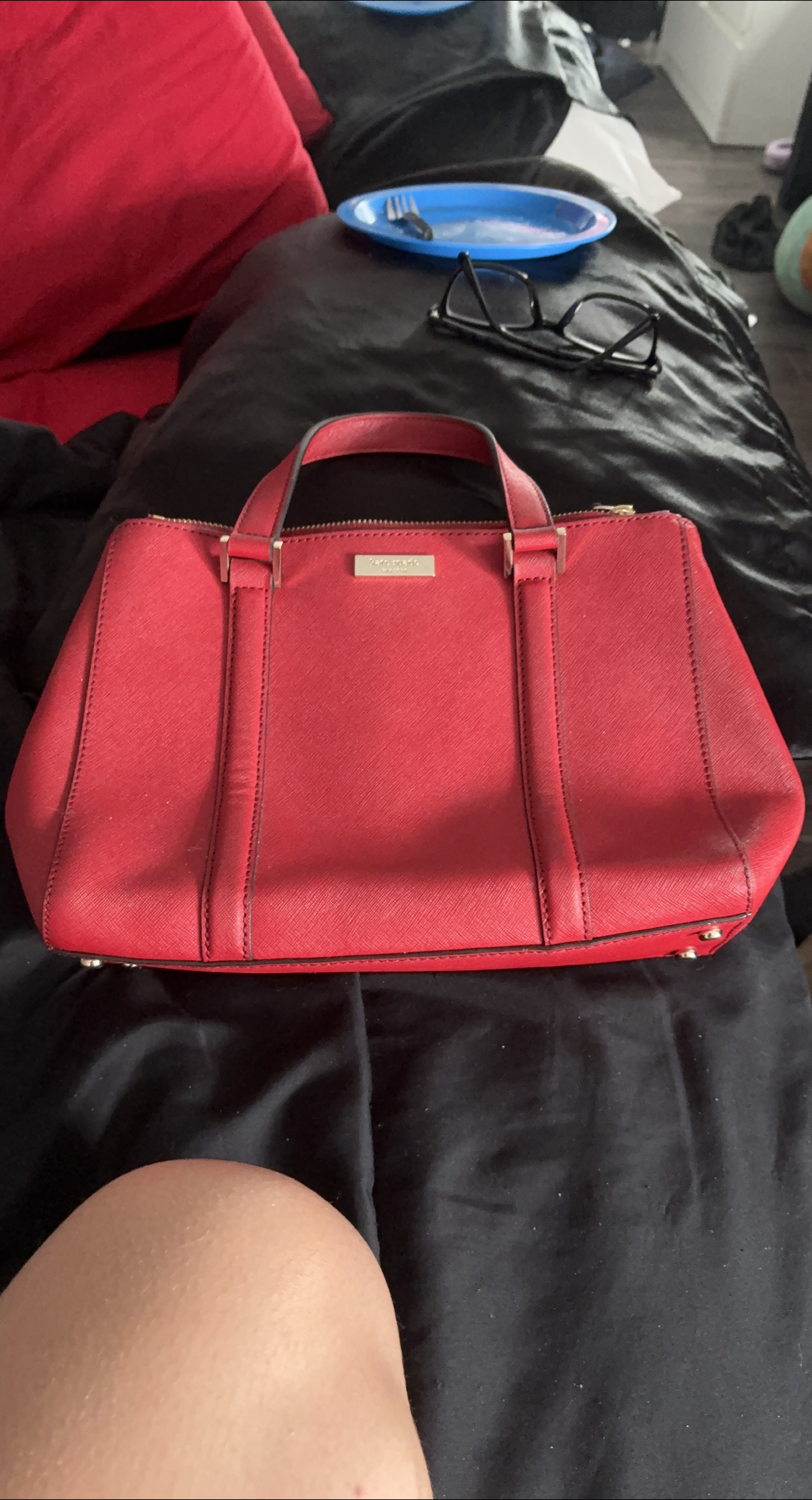 Beautiful red handbag. Perfect for a day out to brighten up your day and have some fun. Features a top handle and gold hardware.