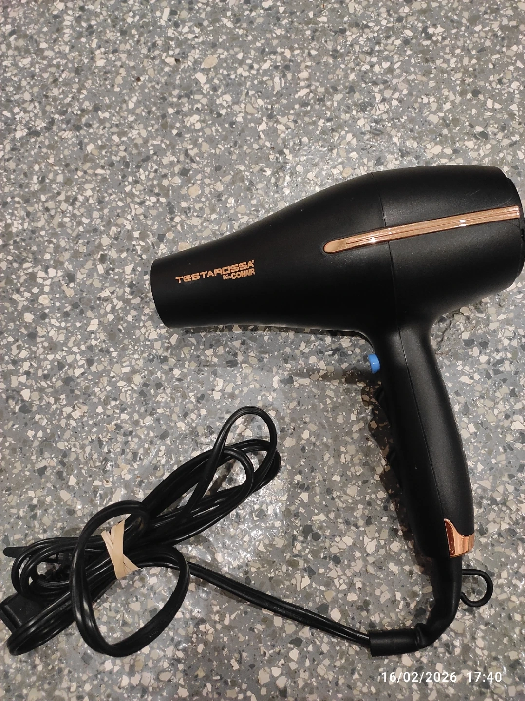 This black Conair Testarossa hair dryer is a handy tool for quick drying. It features rose gold accents and a blue button. The cord is black and measures about 6 feet long.