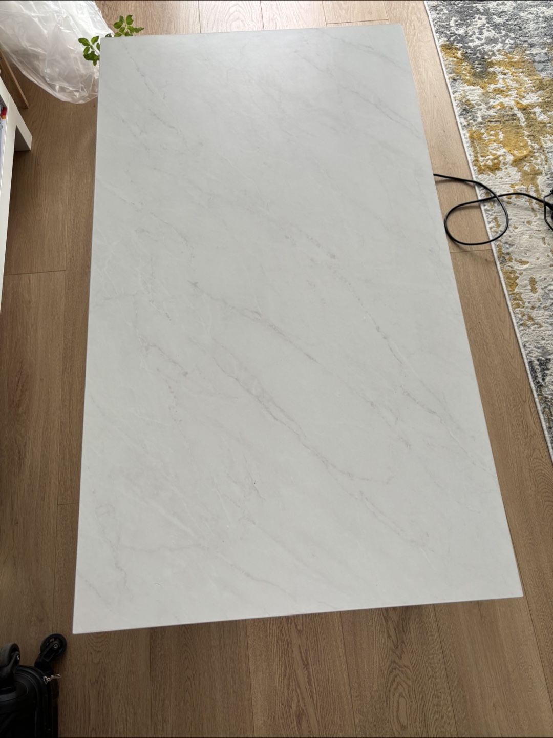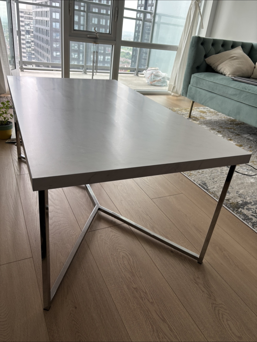 A rectangular coffee table. Features a white surface. Has metal legs with a crisscross design. A perfect place to rest your tea and enjoy a quiet afternoon.