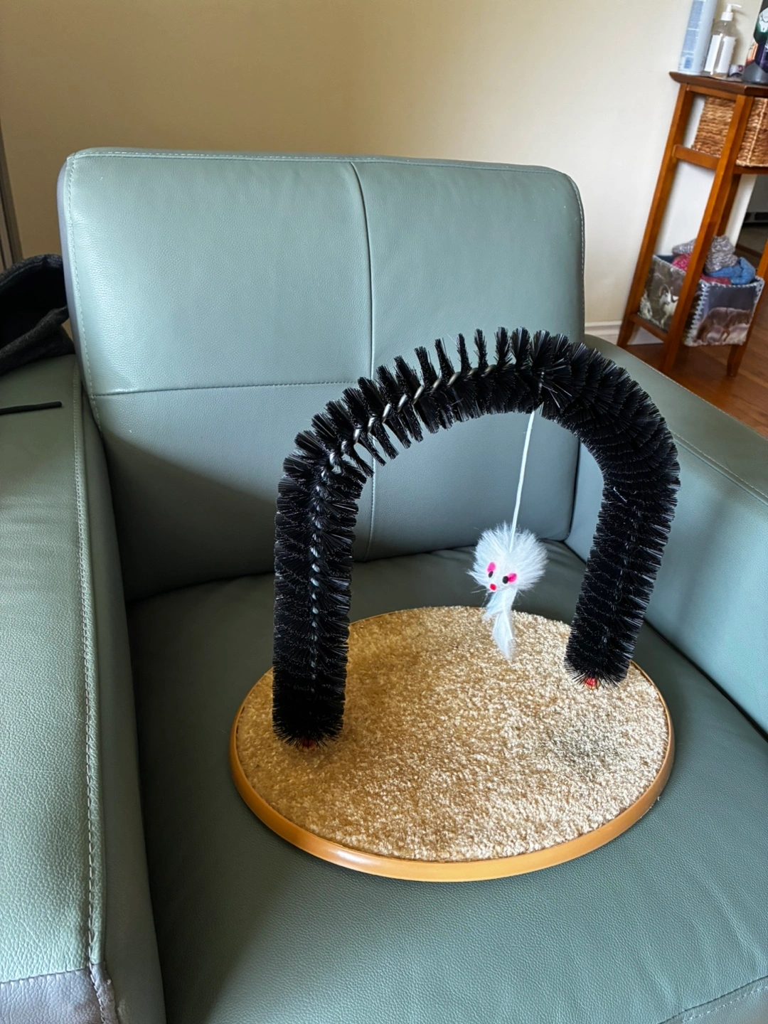 A cat arch scratcher with a built-in toy. Features a circular base with a textured surface. The arch is covered in scratch-friendly material, and a small toy dangles from it. This would be a calming spot for your feline friend.