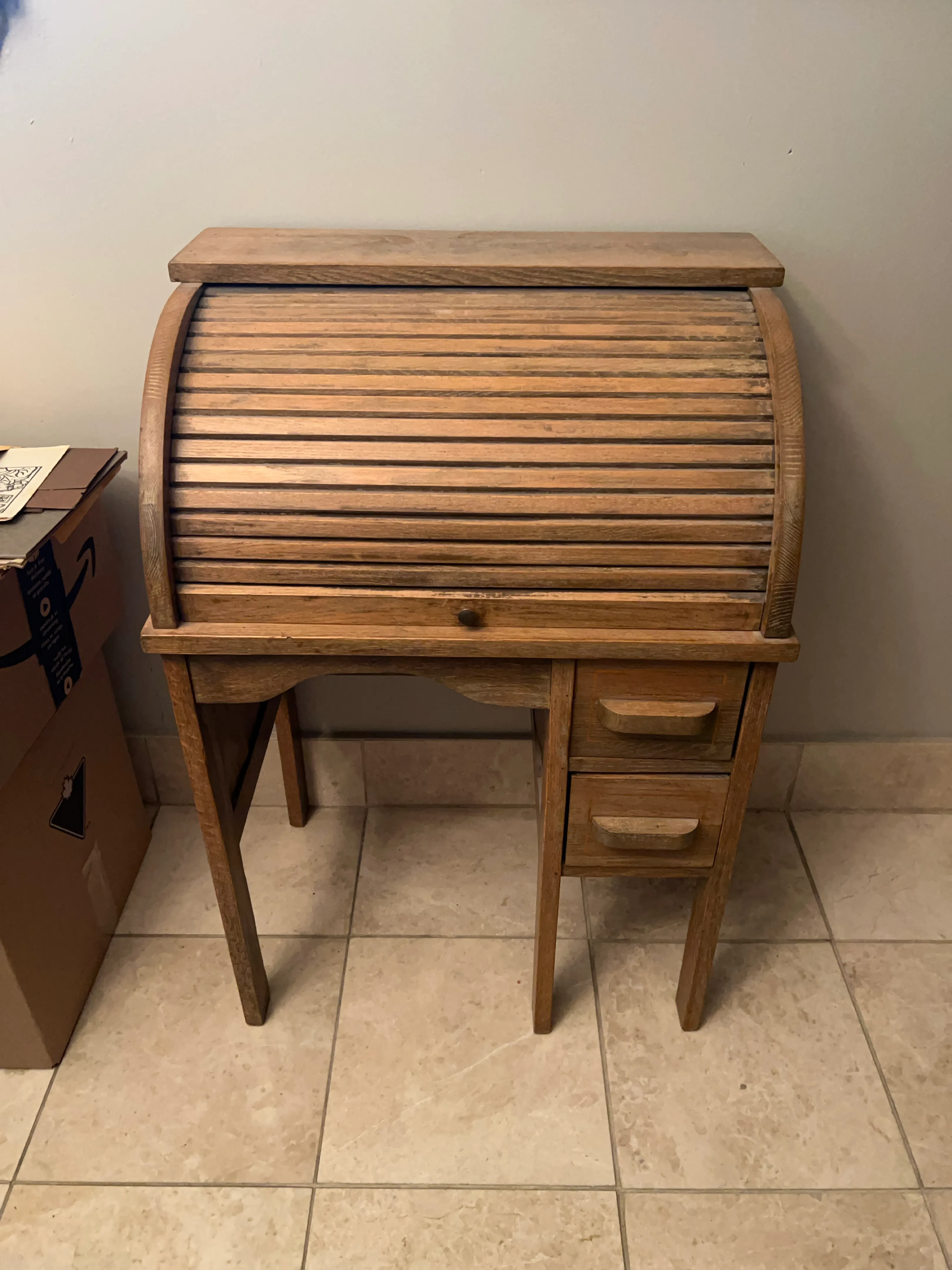 A charming antique roll top desk made of wood. Featuring two small drawers and a little cubby. Roll top opens and closes. One of the drawers is cracked on the bottom making it difficult to close (need to push it up from the bottom, see picture) so needs repair or even duct tape for a quick fix. One side also cracked.