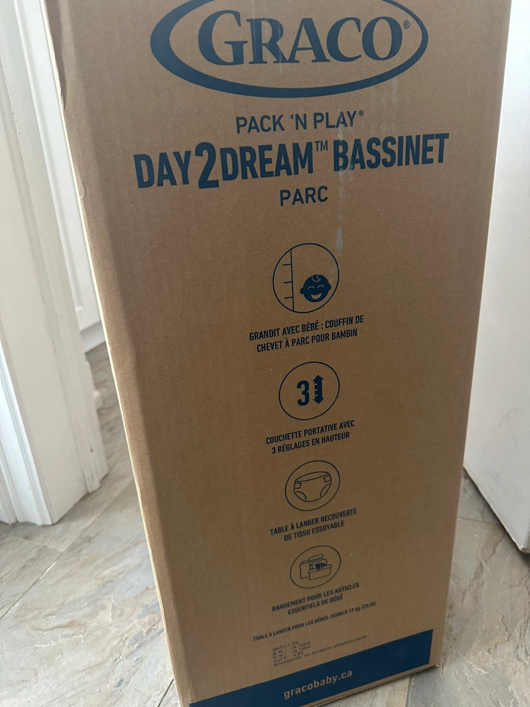 Brand new, sealed in box. Never ended up using it. The perfect spot for your little one to relax and nap. It's a Pack 'n Play with a bassinet, a changing table, and a canopy. There are also storage pockets and wheels. This is a great item for any parent.
