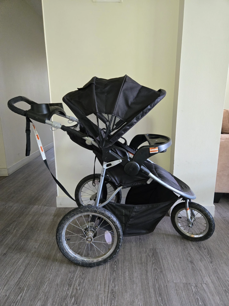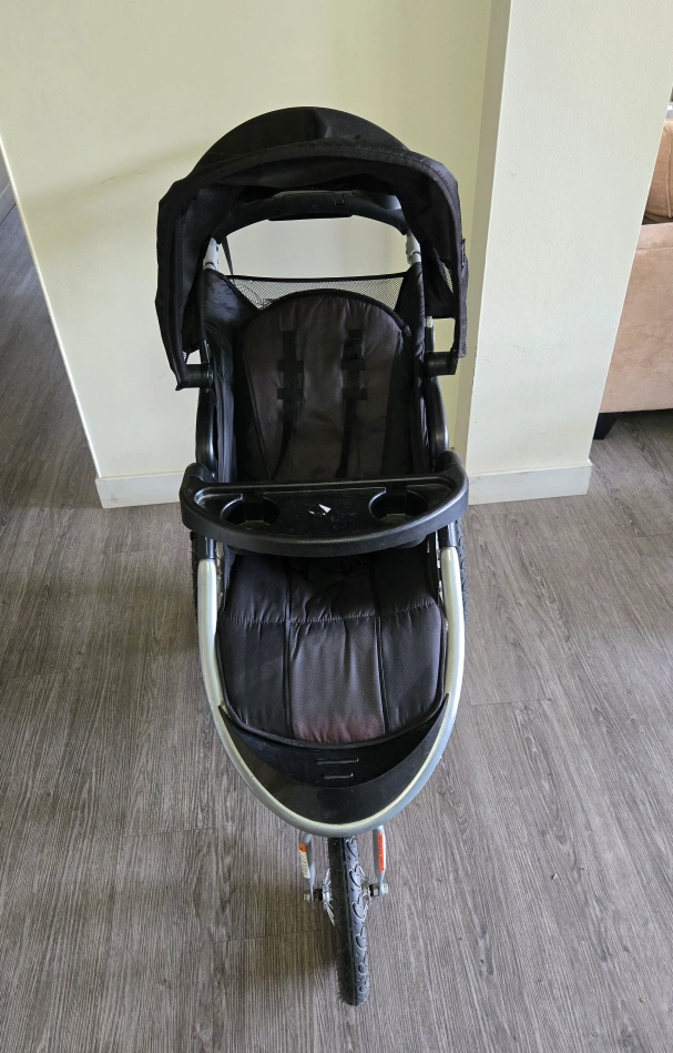 Black jogging stroller (Baby trend). Three wheel design. Features a sunshade and a tray for drinks. Has a basket underneath. Perfect for taking a peaceful stroll with your little one. Comes with an additional rain/wind cover. Condition like new. Foldable and easily fits in car boot.