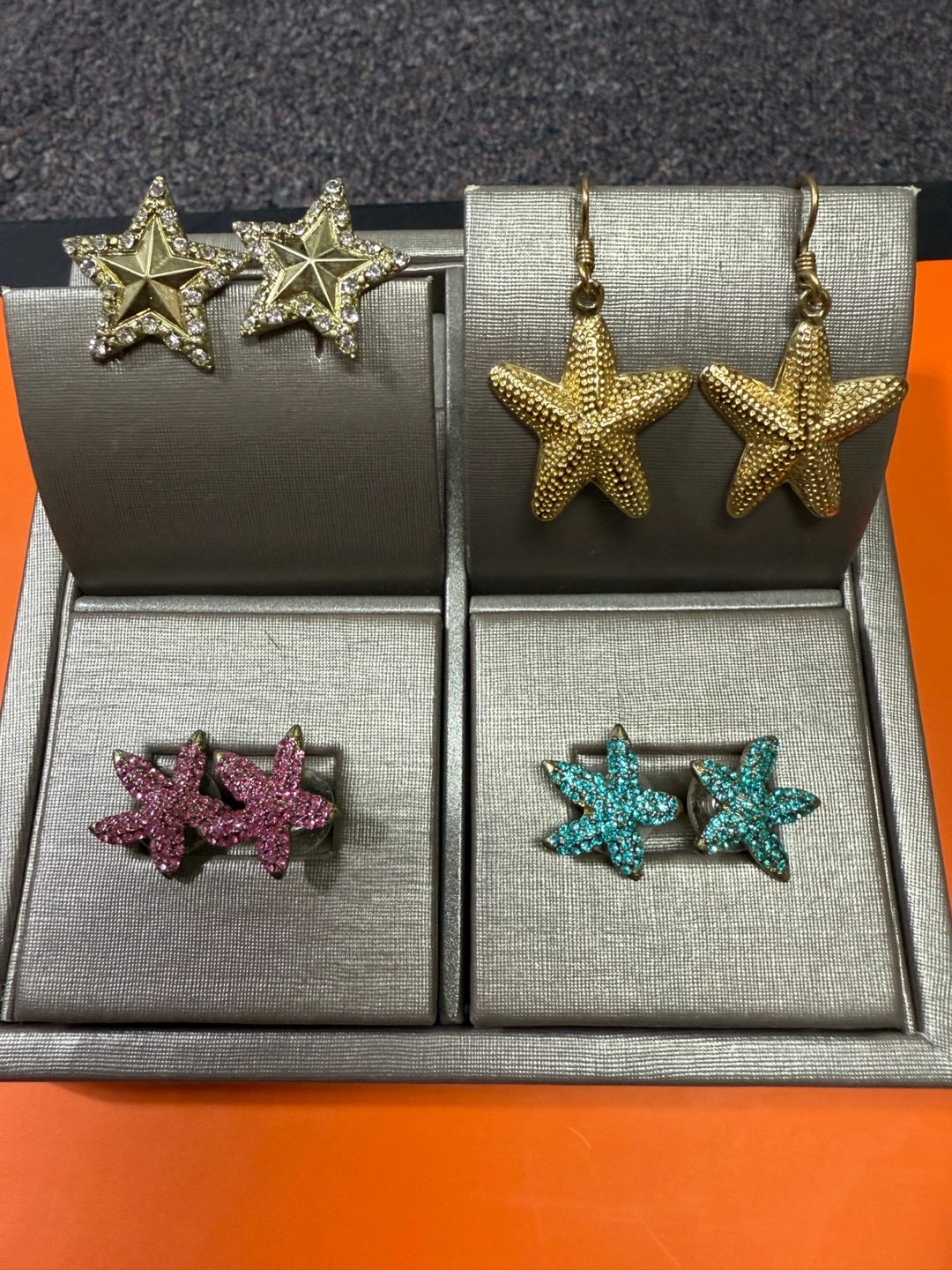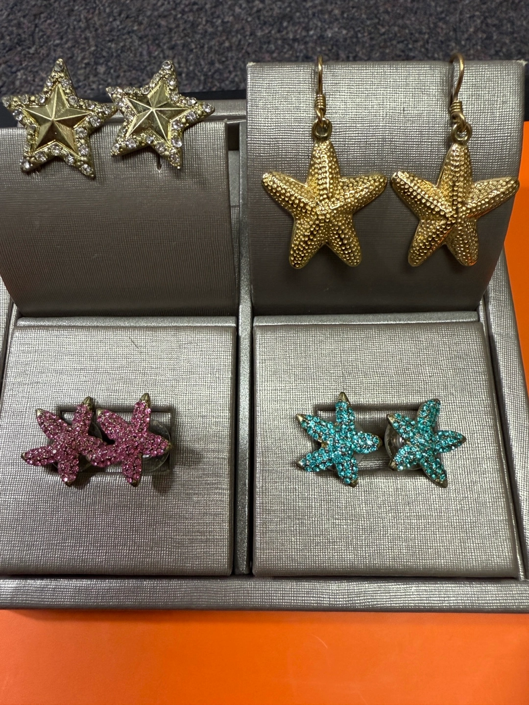 1000+A selection of different star-shaped earrings. Includes earrings in pink, blue, and gold colours. A great way to enhance any outfit.