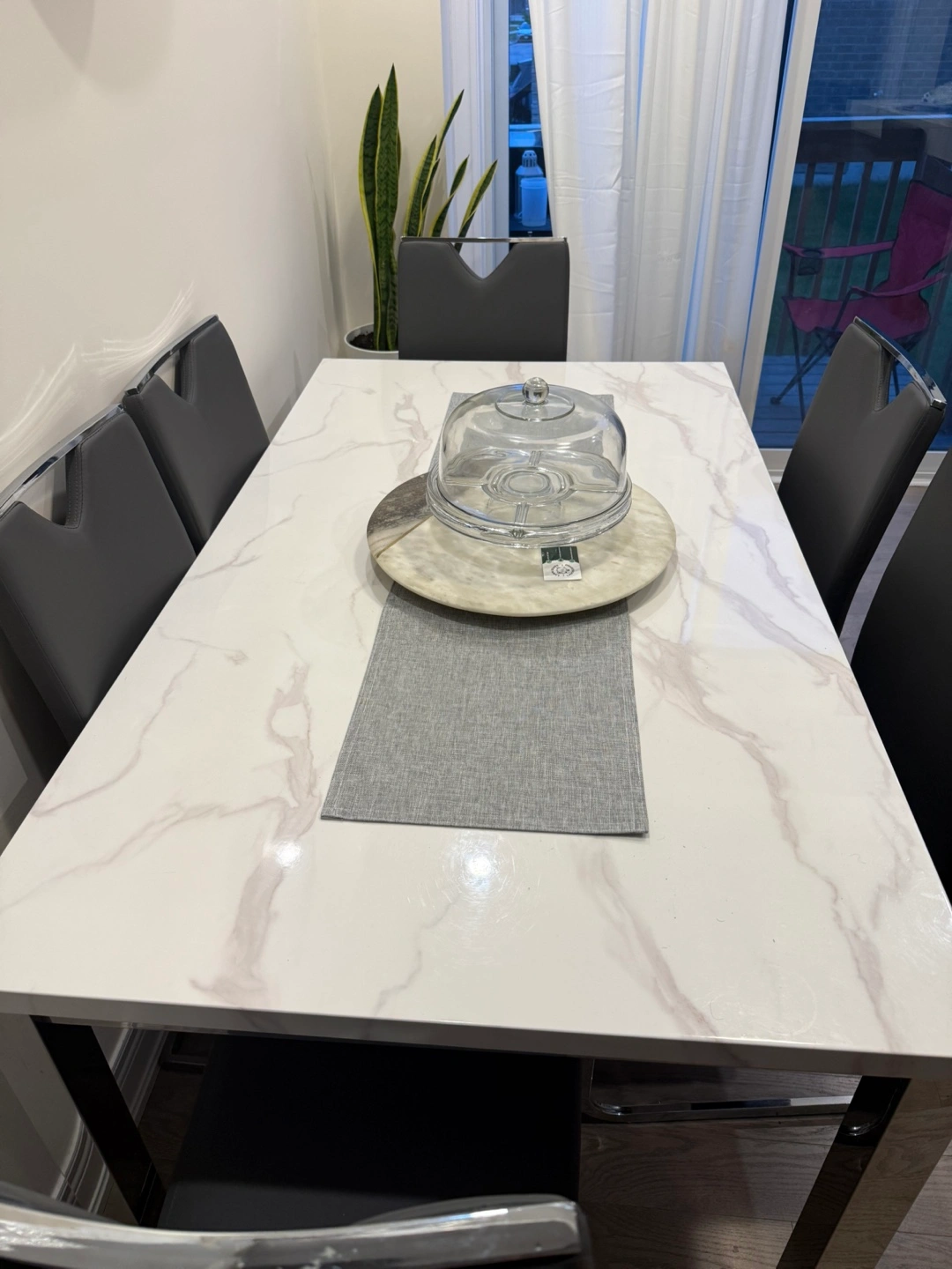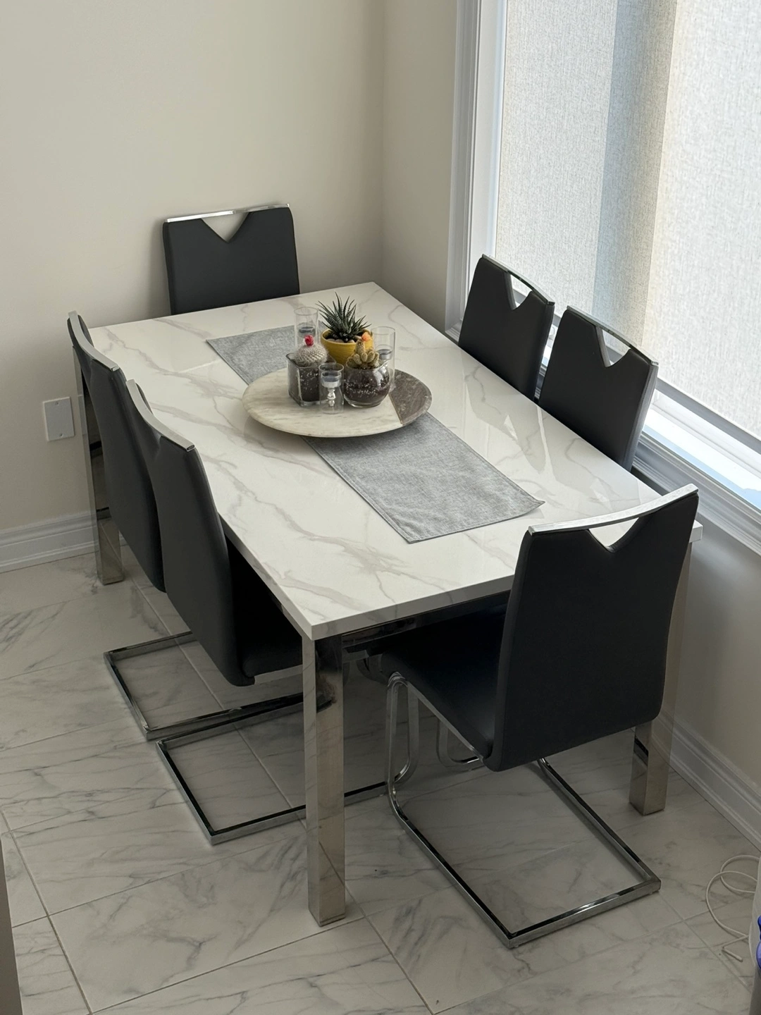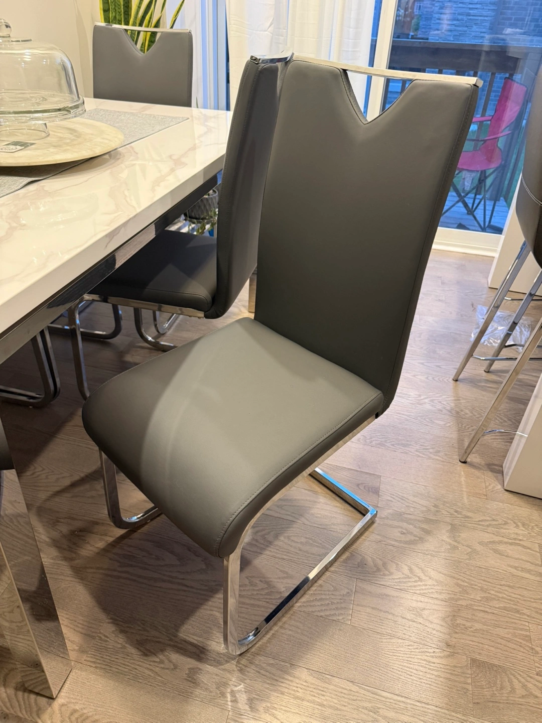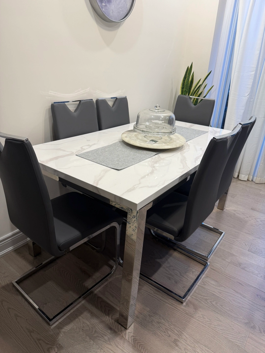 A stunning modern dining table set. The table with a white marble-like top, and chrome legs. Six gray leather-like chairs with unique backs and chrome legs. This set is perfect for creating a relaxing dining experience.