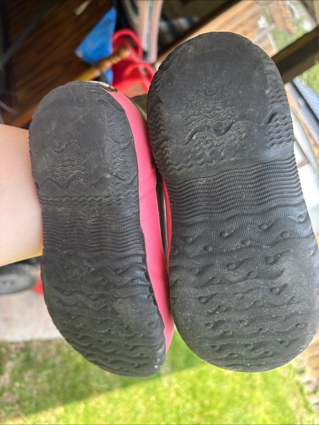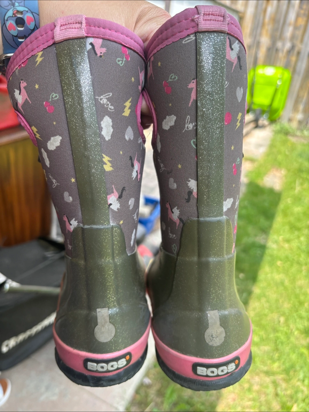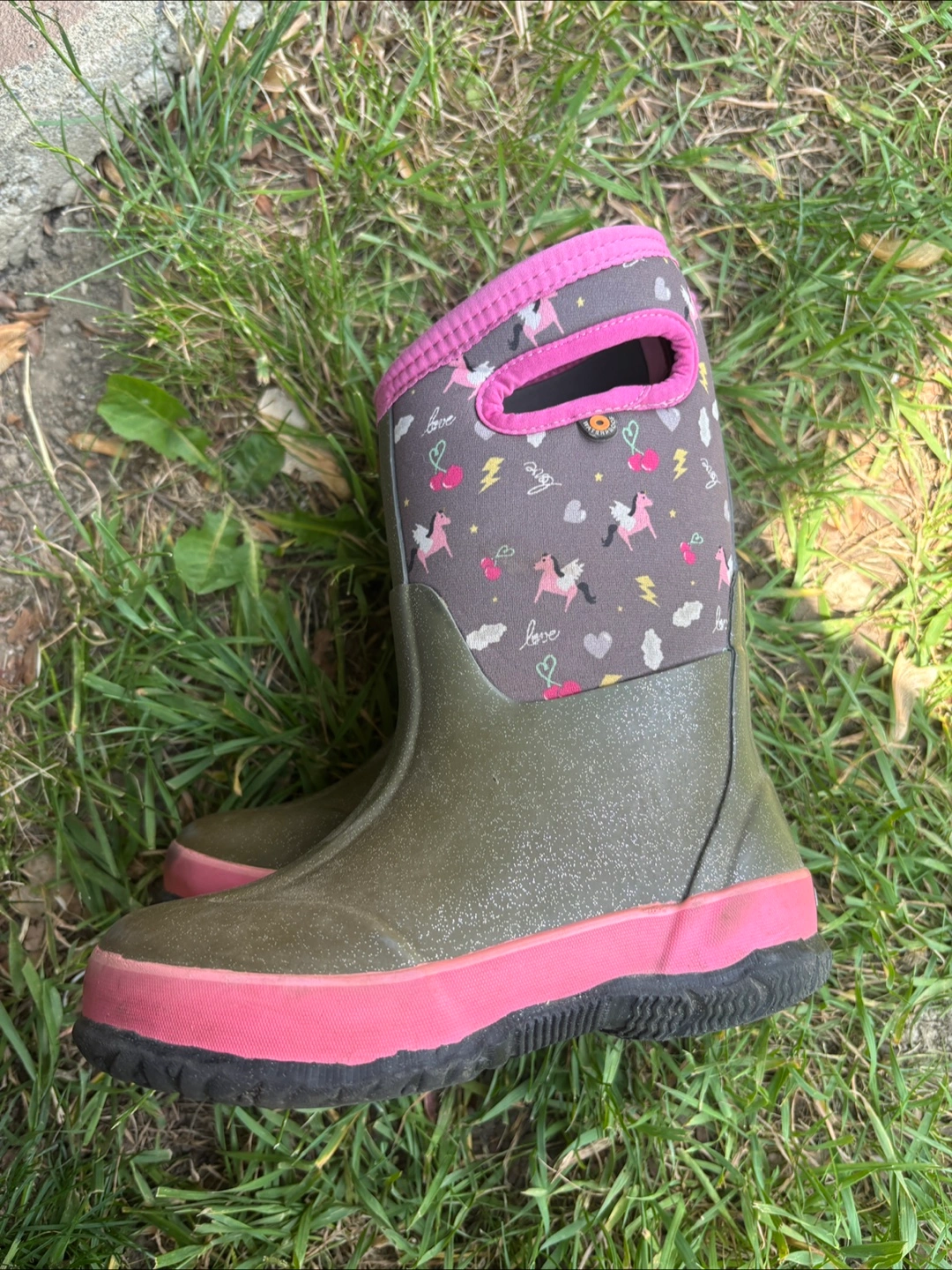 These boots are a beautiful grey colour with a pink trim. They feature a fun pattern of hearts, clouds and pegasus. The bottom of the boots are black with a ridged pattern. These boots will keep your little one's feet dry and comfy.